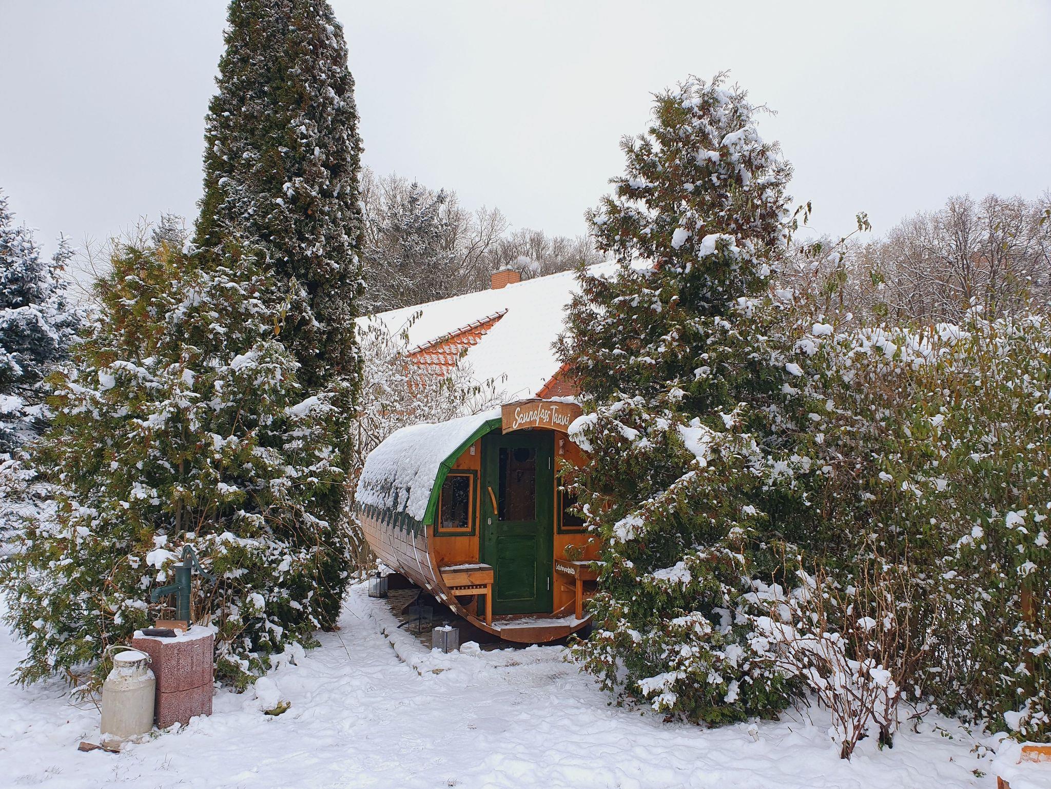 Alle Räume sind beheizt, im Badezimmer sogar mit einem Highlight: einer zusätzlichen Infrarot-Bilderheizung für maximalen Comfort. Das Erdgeschoss ist hochwertig gefliest & das Parkett im Obergeschoss sorgt für ein angenehmes Raumklima unter dem Dach. Die Möblierung besteht nahezu vollständig aus hochwertigen Massivholzmöbeln. Komplettiert wird das Ferienhaus Milena durch eine überdachte Terrasse mit Strandkorb & Sitzgelegenheiten (mit (Vor-) Mittagssonne für gemütliches Frühstücken draußen), 2 eigene Parkplätze am Haus (weitere Parkplätze kostenfrei 5 Min. zu Fuß) & einen eingezäunten grünen sonnigen Garten mit Sitzgelegenheiten, Liegen, Sandkasten, Feuerstelle, Hollywoodschaukel & Fahrradständern (gemeinsame Gartennutzung mit Ferienhaus Tamara nebenan). Abends lädt der steinerne Grillkamin mit angrenzender überdachter Picknicklaube zum Barbecue ein. Im Garten befindet sich auch unser großes Sauna-Fass „Taavi“. Die Nutzung erfolgt in Absprache mit dem Ferienhaus Tamara nebenan. Das Fass hat einen separaten Vorraum zum Umziehen und Ausruhen und einen großen Saunaraum mit 2 langen Liegen.