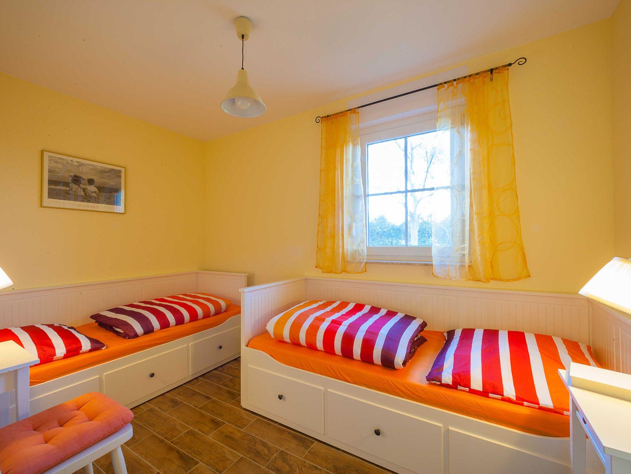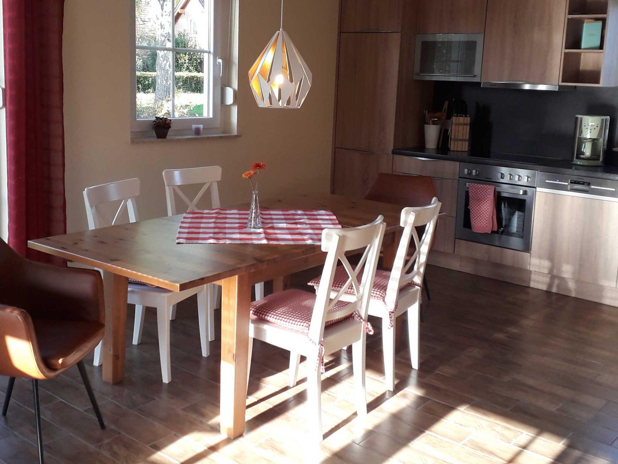 Das familienfreundliche Ferienhaus bietet auf 100m² Wohnraum im EG eine Wohnküche mit kleinem Sofa und Kaminofen (Zugang zur möblierten Terasse), ein Schlafzimmer mit 2 Einzelbetten und einem Badezimmer Regendusche und WC. Im OG sind 2 Schlafzimmer (1 Doppelbett, 2 Einzelbetten), ein Badezimmer mit Regendusche und WC und Wohnbereich mit Sitz- bzw. TV-Ecke (Zugang zum Balkon). Die Fußbodenheizung trägt zum Wohlbefinden in der kalten Jahreszeit bei. Alle Schlafzimmer verfügen über Insektenschutz. Holzgrill und Unterstellmöglichkeit für Fahrräder in einem verschließbaren Schuppen.Das Grundstück ist umzäunt und auf der Terrasse können Sie auf der Himmelsliege entspannen.