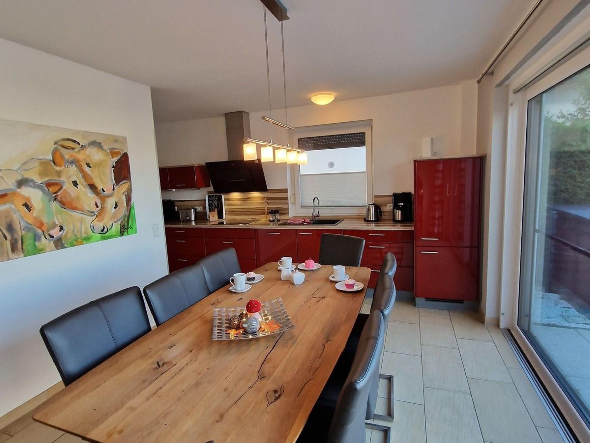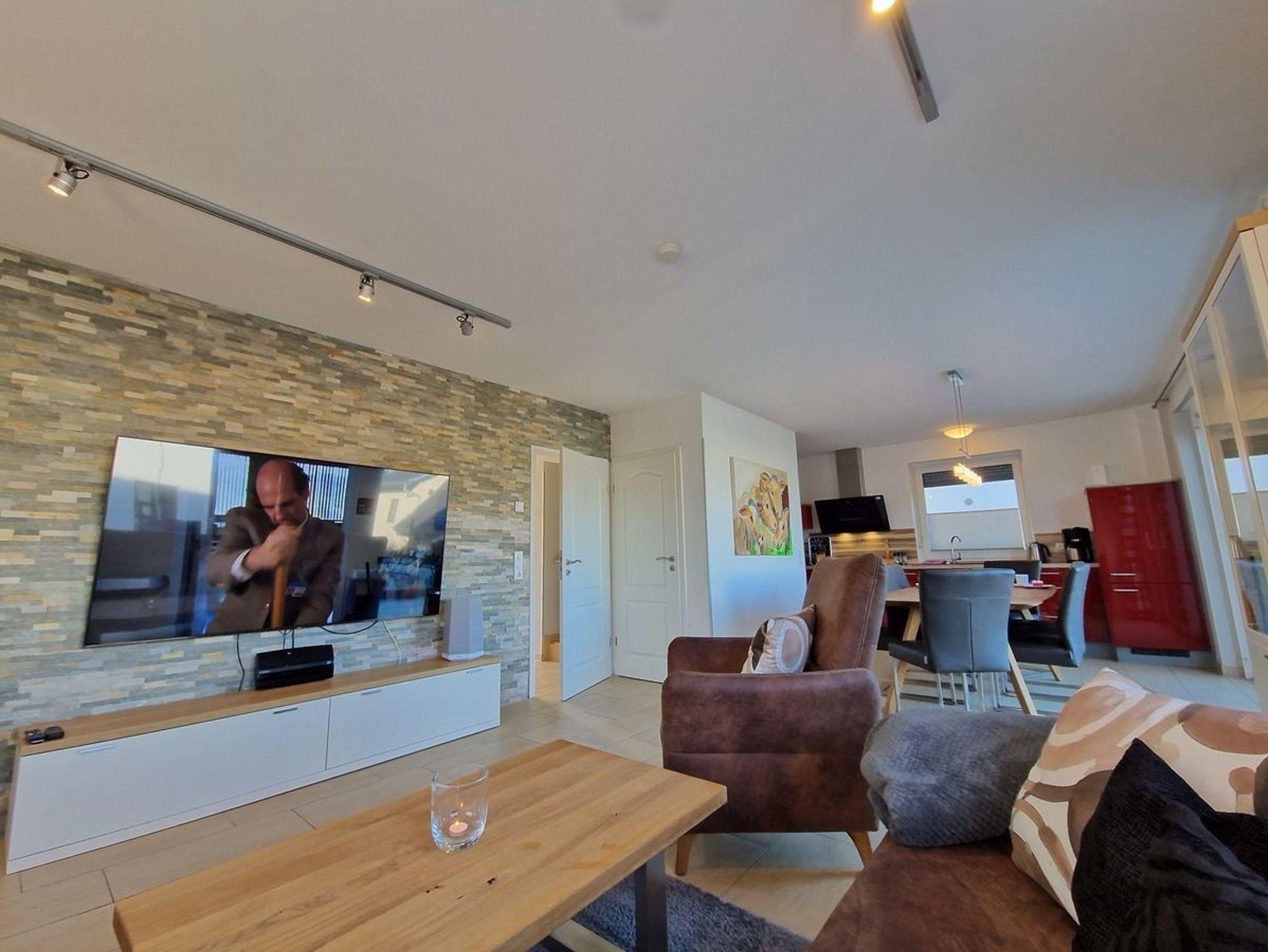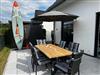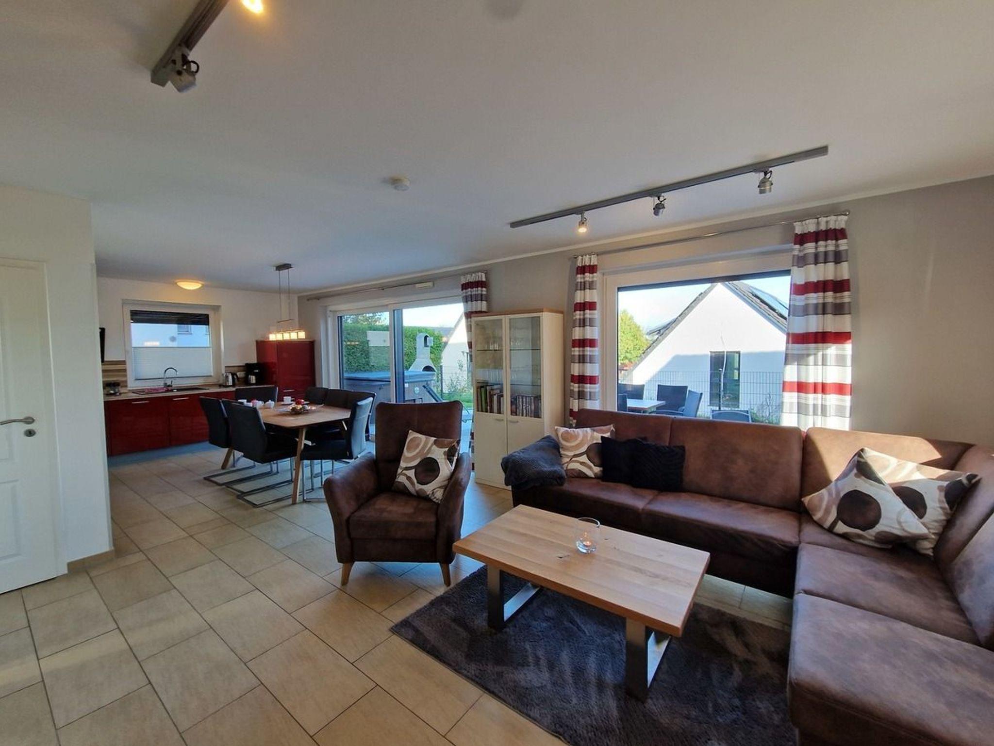 Aus dem offenen Wohn und Essbereich gelangen Sie in den eingezäunten Außenbereich mit Terrasse, einem Holzkohlegrill, eigenem Außen Whirlpool und gemütlichen Gartenmöbeln. Genießen Sie den Ausblick zusammen mit Freunden und Familie.