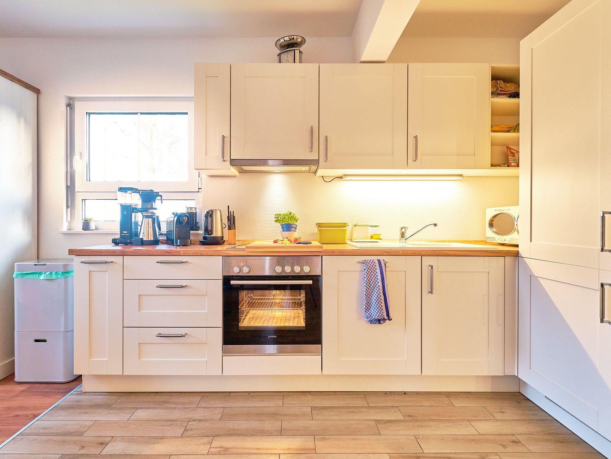 Der großzügige Wohnbereich im Erdgeschoss läd zum gemeinsamen Kochen, Essen und Entspannen ein. Unsere Küche ist vollausgestattet mit Ofen, Mikrowelle, KÜhl-Gefrierschrank und Geschirrspülmaschine, zwei hochwertigen Kaffeemaschinen, Wasserkocher, Eierkocher, Backzubehör und Kindergeschirr.
