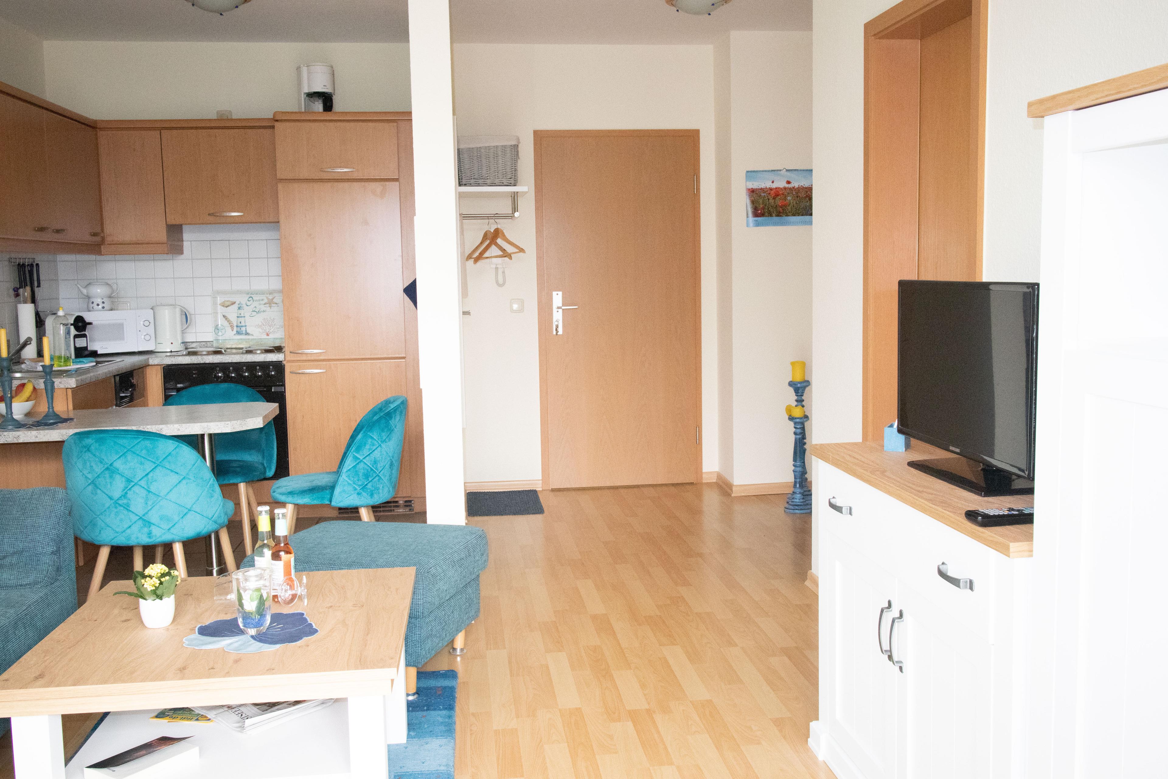 Die Ferienwohnung verfügt über einen Wohnbereich mit offener Küche, ein Schlafzimmer, ein Bad mit Dusche und eine Terrasse.