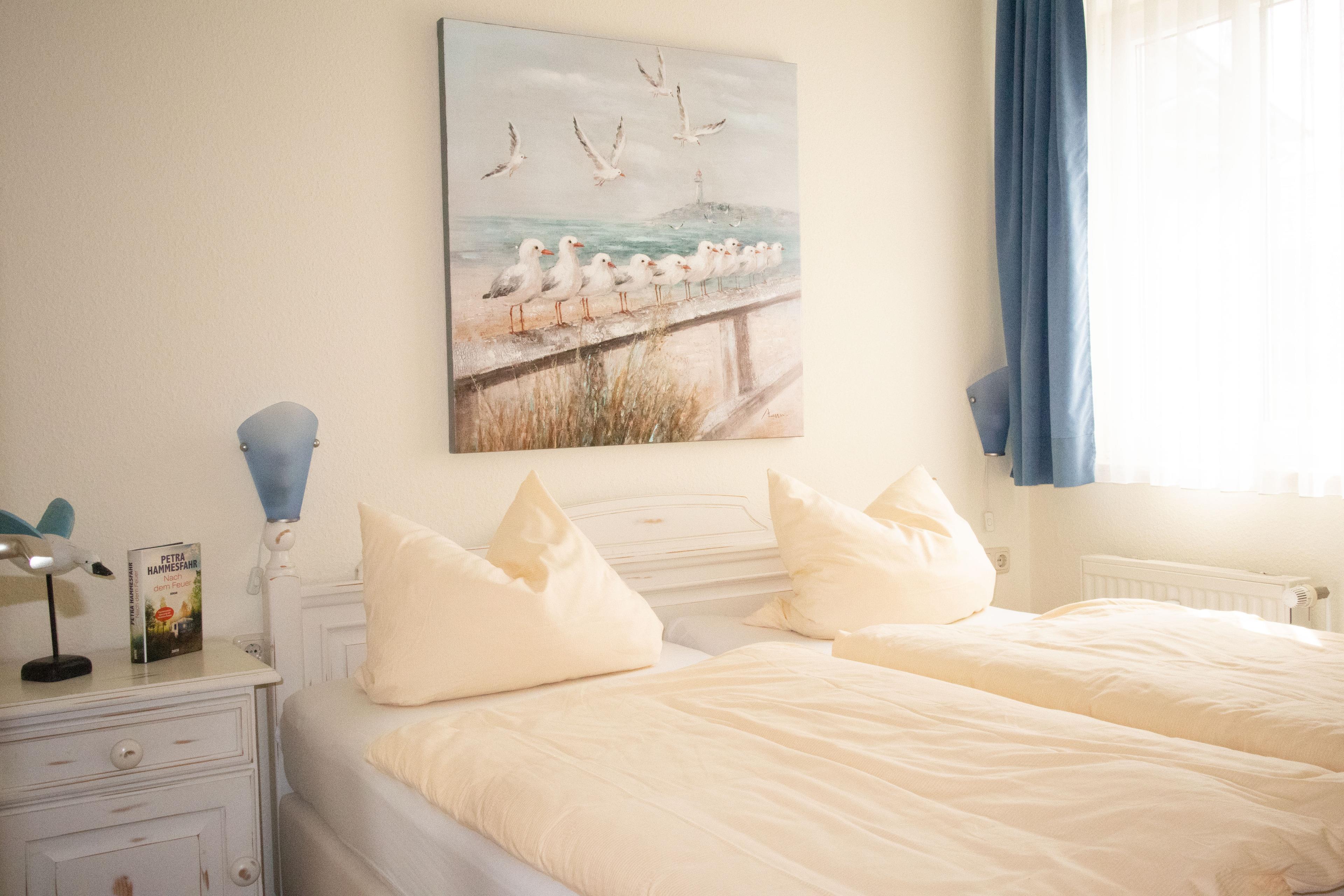Im Schlafzimmer bietet Ihnen ein Boxspringbett ausreichend Platz für einen erholsamen Schlaf. Ihre Urlaubskleidung können Sie im geräumigen Kleiderschrank unterbringen.
