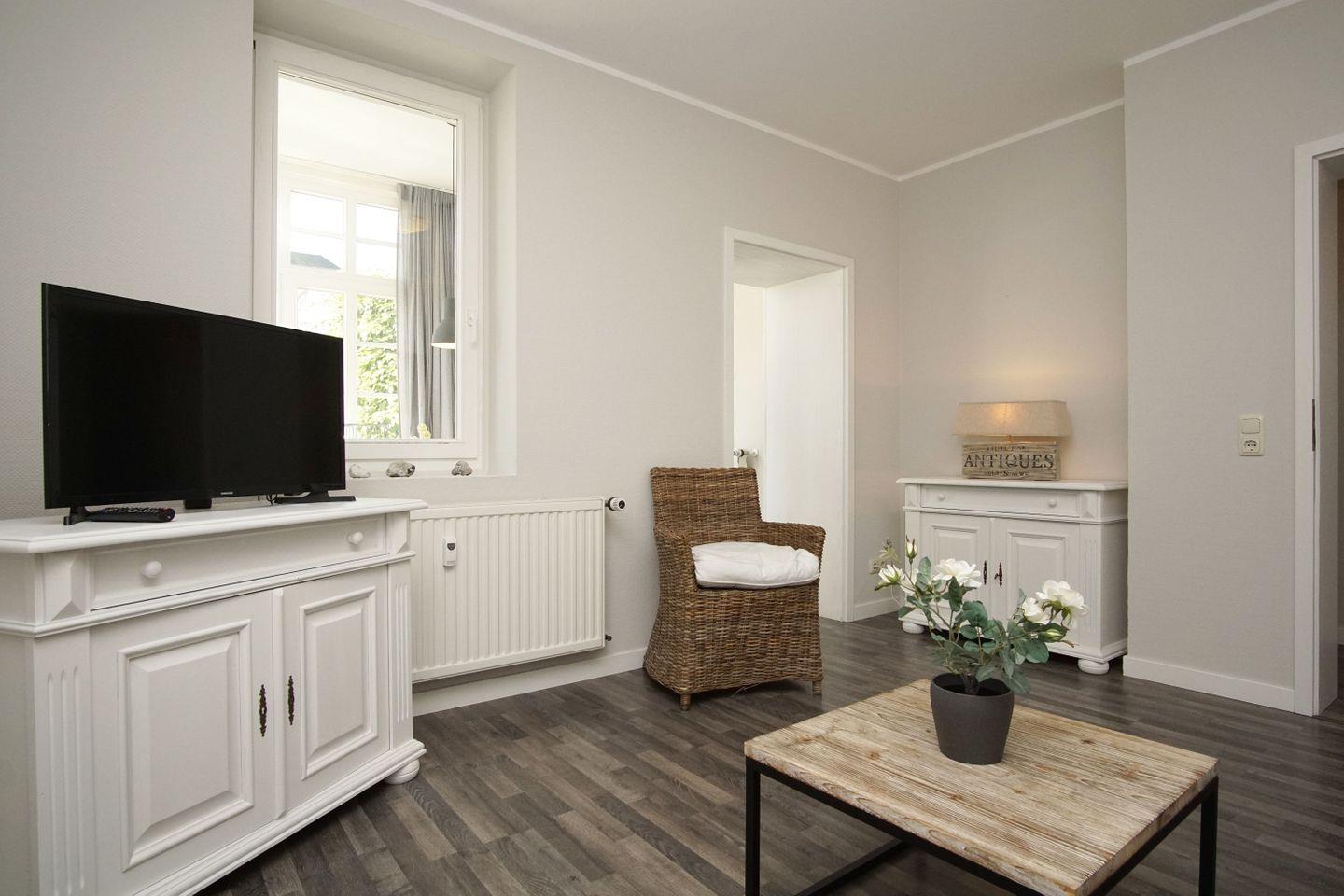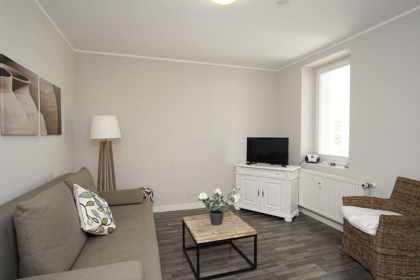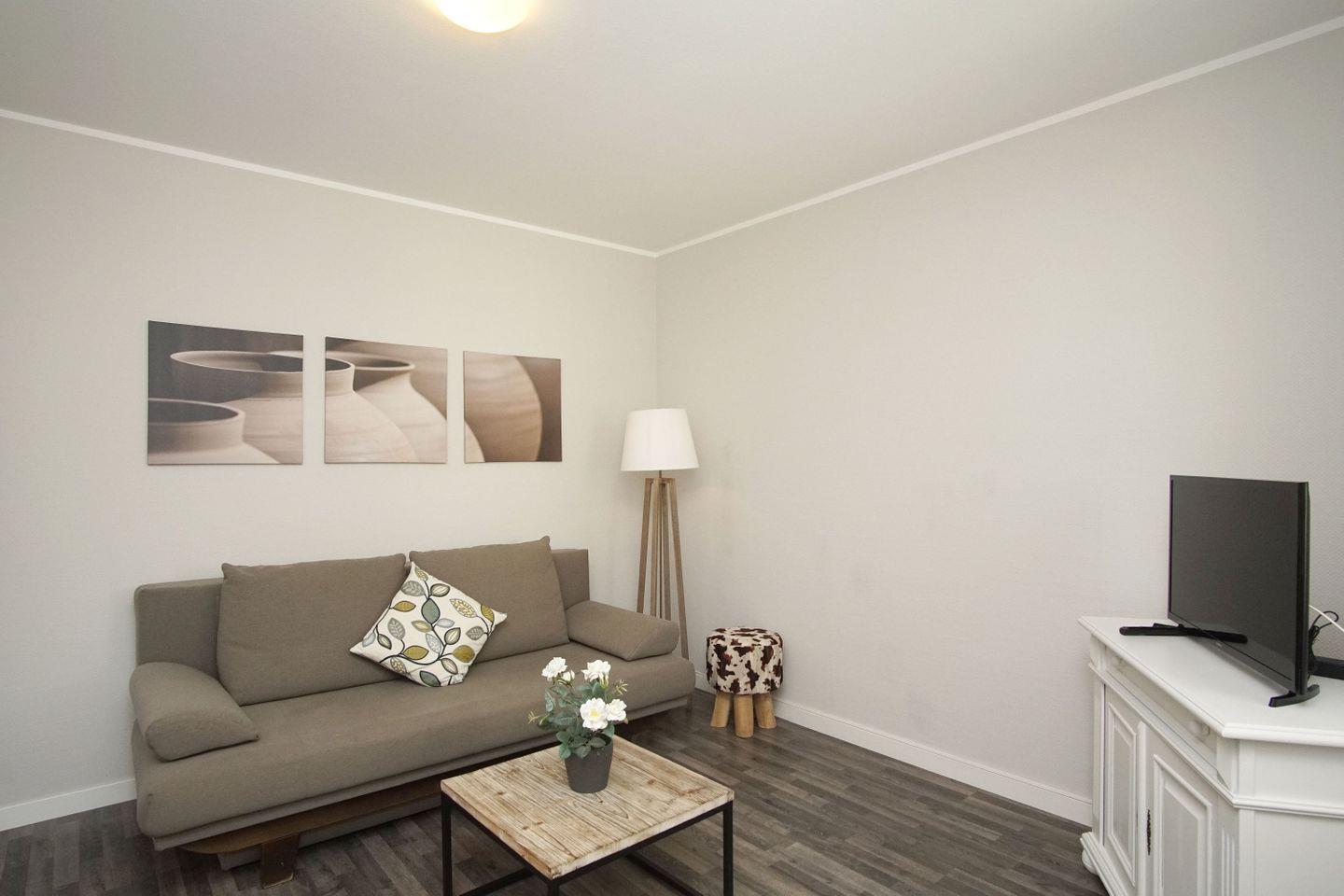 WOHNEN // Wohnraum mit Essbereich, Sitzgarnitur mit bequemer Schlafcouch, Flachbild-TV, CD-Spieler ++