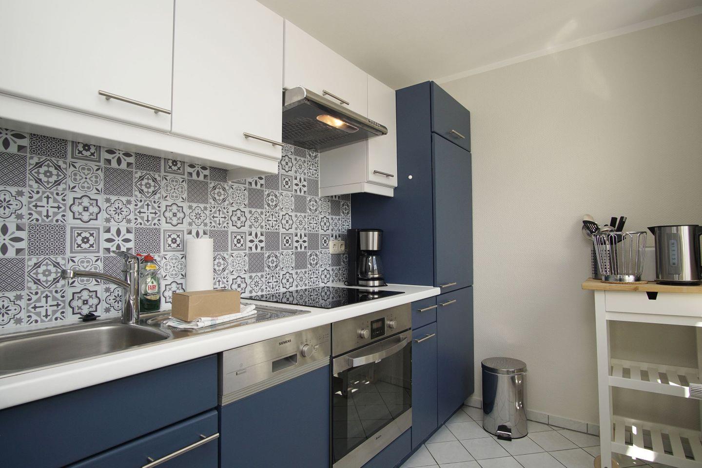 KÜCHE // separate Küche, 4-Platten Herd, Spülmaschine, Kühlschrank mit Gefrierfach, Backofen, Toaster, Wasserkocher, Kaffeemaschine, reichlich Besteck, Geschirr und Küchenutensilien ++
