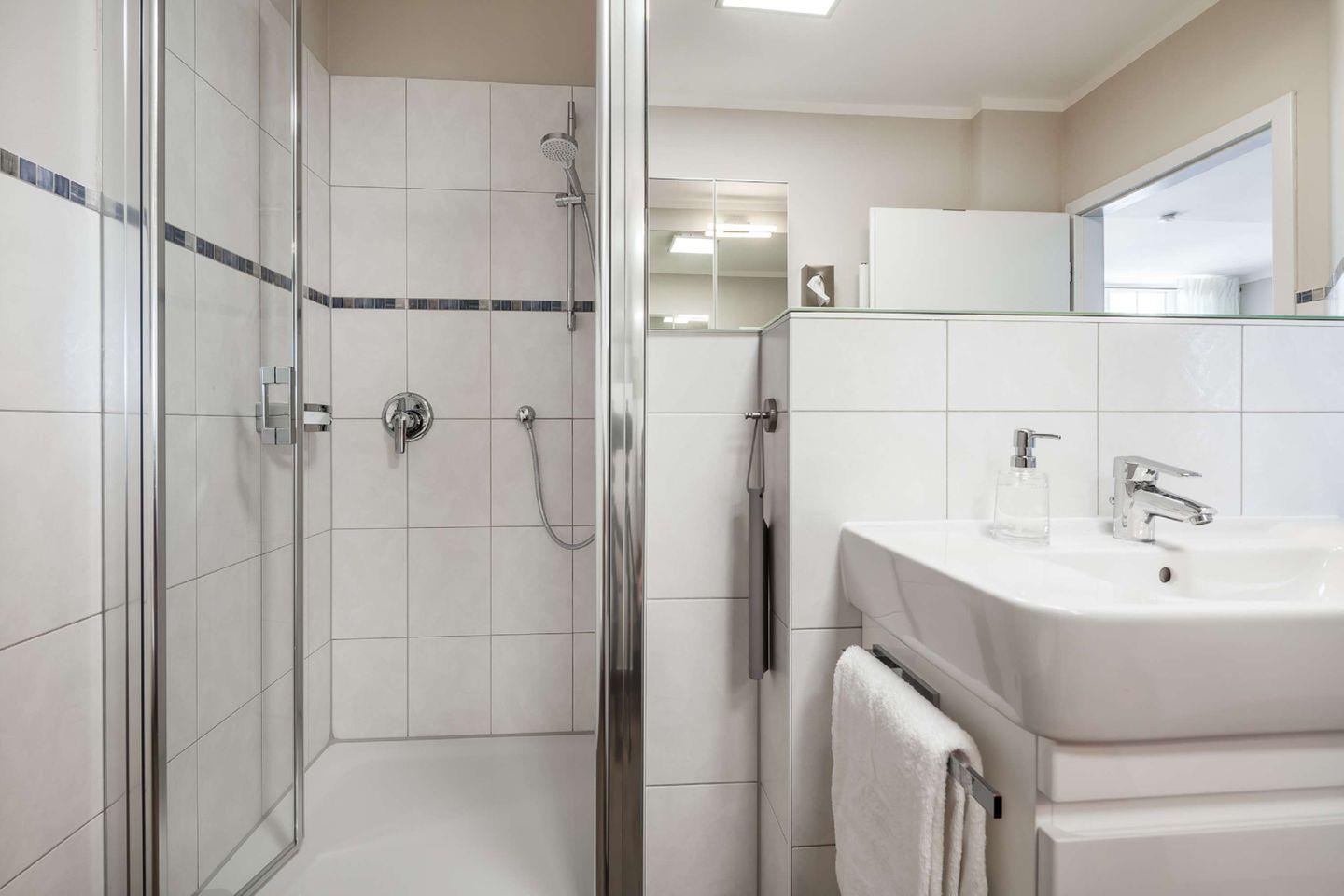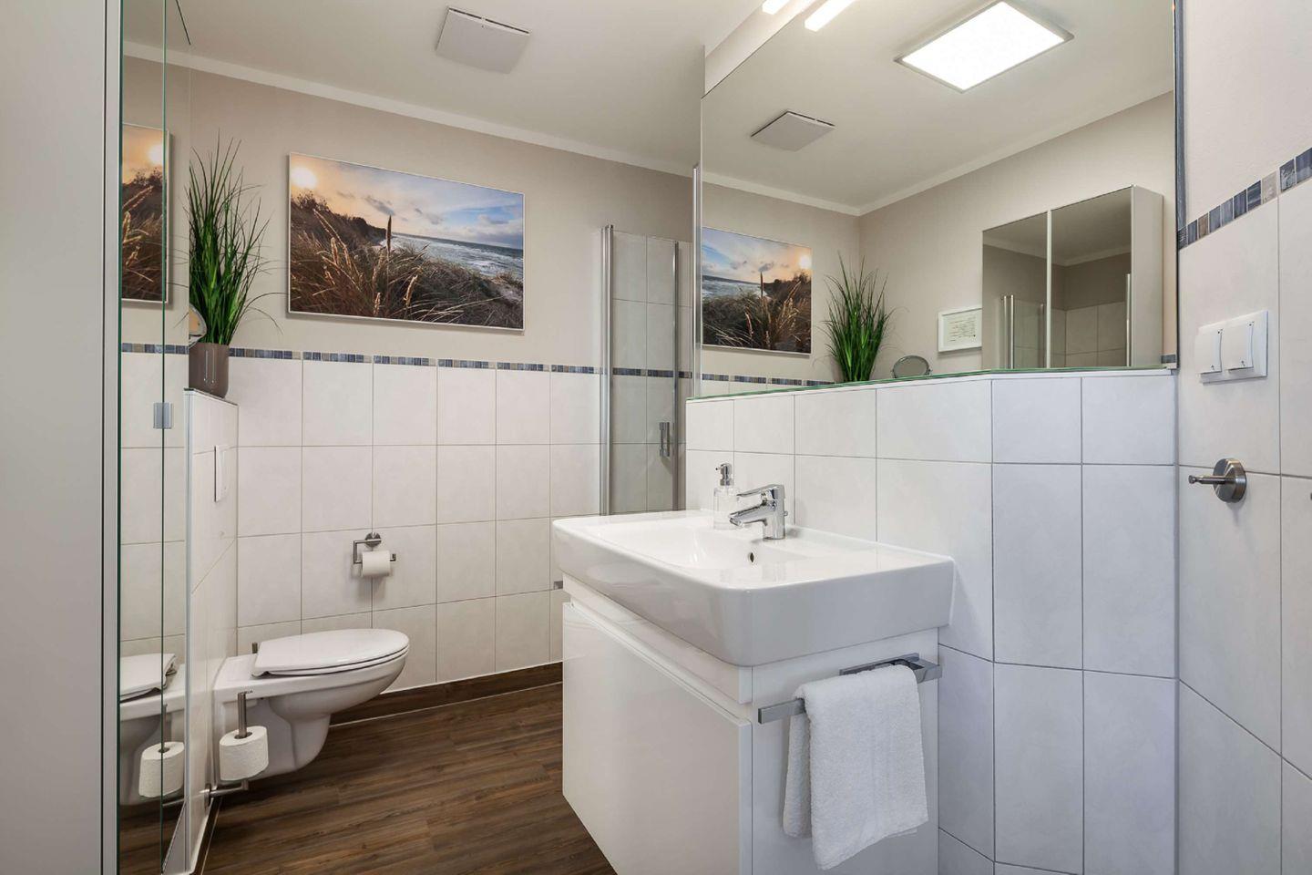 BAD // innen liegendes Bad mit bodengleicher Dusche, Handtuchwärmer, Ablagemöglichkeiten, WC, Föhn und Kosmetikspiegel ++