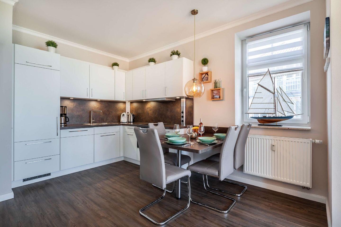 KÜCHE // offene Küche, Induktionskochfeld, Spülmaschine, Kühlschrank mit 4-Sterne-Gefrierfach, Kombi-Mikrowelle, Cafissimo-Kapselmaschine und Milchaufschäumer, Kaffeemaschine, Toaster, Wasserkocher, reichlich Besteck sowie Geschirr und diverse Küchenutensilien ++