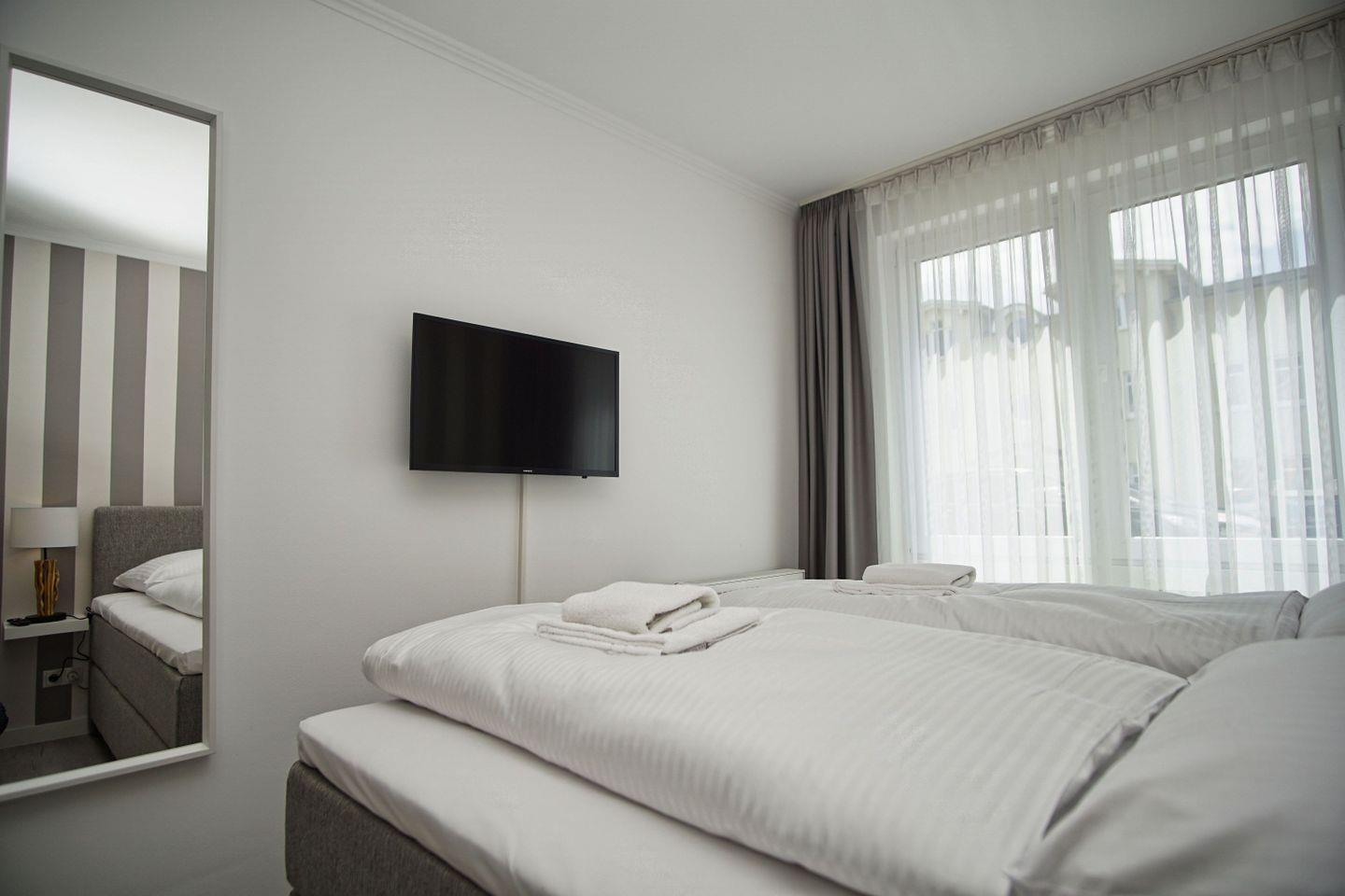 SCHLAFEN // ein Schlafzimmer mit bequemem Boxspringbett und Flachbild-TV ++