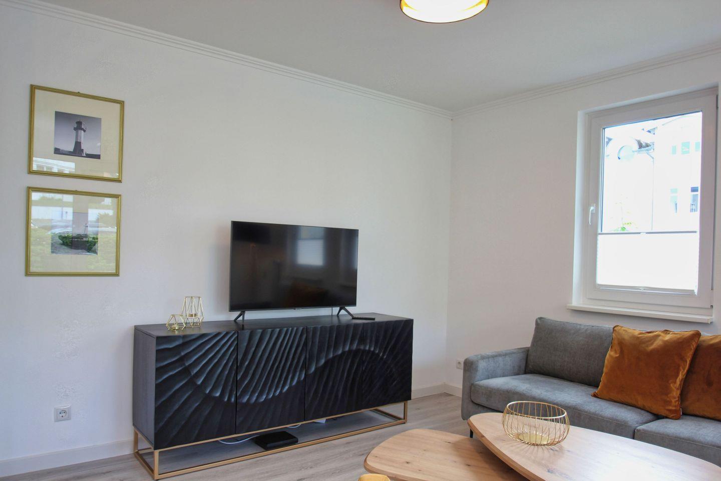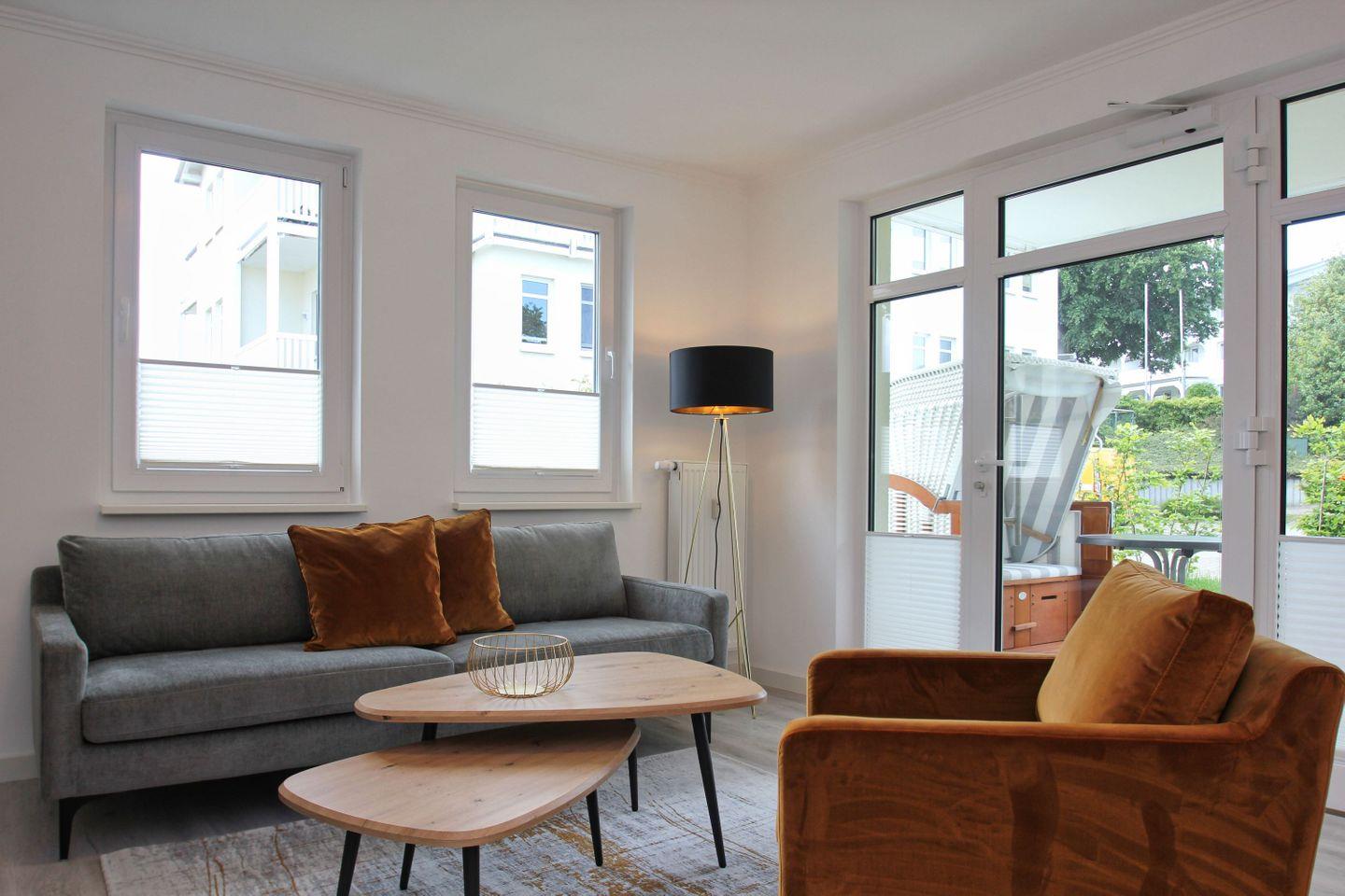 WOHNEN // Wohnraum mit Essbereich, Sitzgarnitur mit bequemer Couch, Kabel-TV, Zugang zur Terrasse mit Strandkorb ++