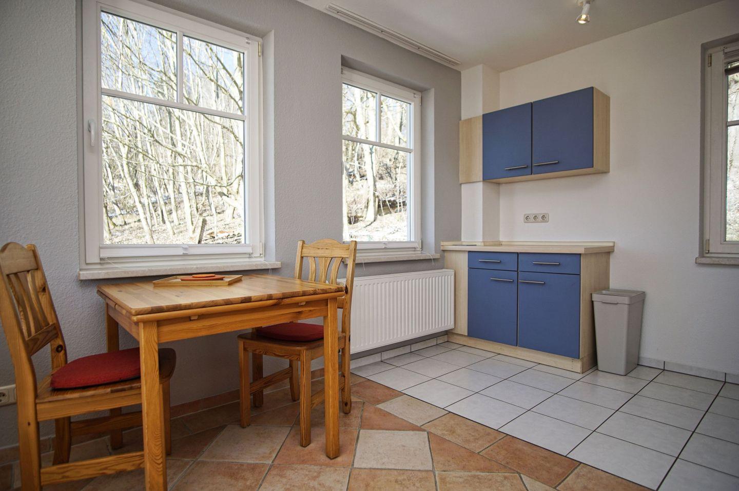 KÜCHE // Küchenzeile, 4-Platten-Herd, Kühlschrank, Backofen, Toaster, Wasserkocher, Kaffeemaschine, reichlich Besteck, Geschirr und Küchenutensilien ++