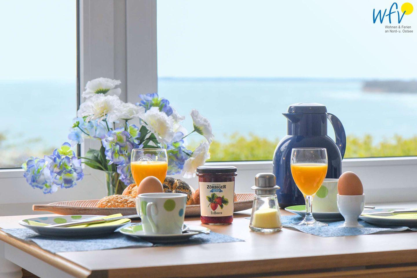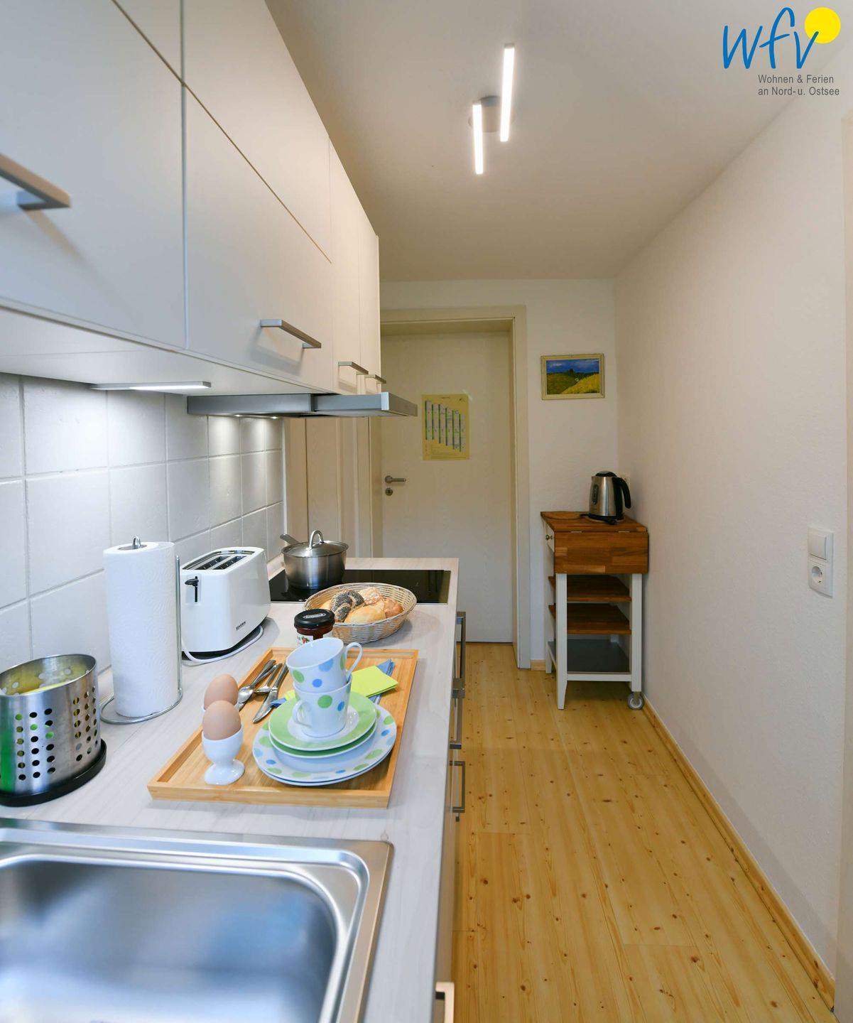 Bereits beim Ferienfrühstück genießen Sie vom Essplatz am Fenster aus eine herrliche Aussicht auf die Ostsee! Kaffee und warme Brötchen lassen sich bequem in der modernen Küchenzeile zubereiten. Ebenso wie Snacks für die bevorstehende Wanderung oder das ausgiebige Dinner am Abend. (Der Backofen kann auch als Mikrowelle genutzt werden.)