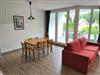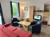 Wohnbereich mit moderner Wohnlandschaft, Couchtisch, Anrichte mit Flat-TV (integr. Radiofunktion) und Esstisch mit 4 Stühlen