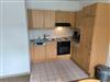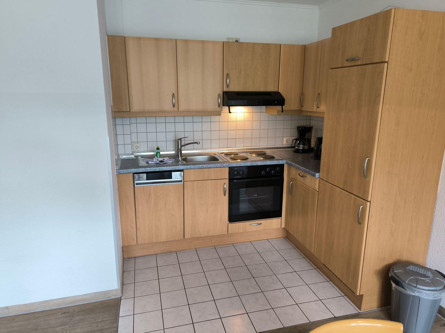 Im Wohnraum integrierte Einbauküche, ausgestattet mit: 4- Platten- Kochfeld, Backofen, Kühlschrank, Geschirrspüler, Toaster, Kaffeemaschine, Wasserkocher und Küchenutensilien