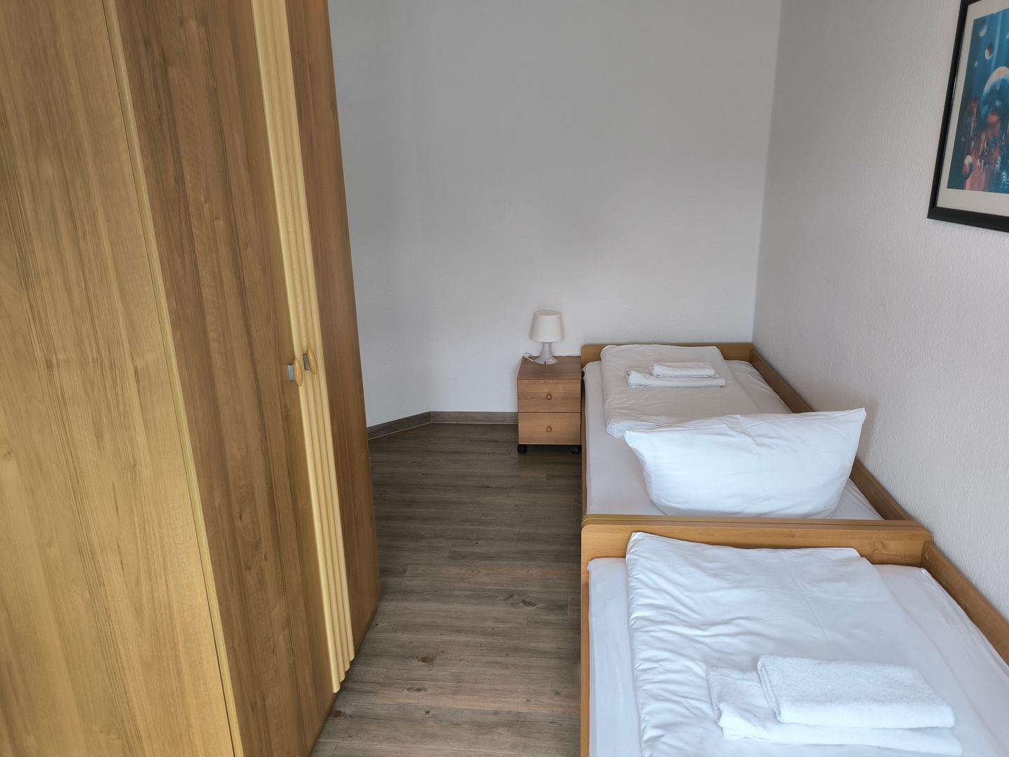 Schlafzimmer mit 2 Einzelbetten (90 x 200 cm ), großem Kleiderschrank, Tisch und Stühlen