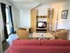 Wohnbereich mit moderner Wohnlandschaft, Couchtisch, Anrichte mit Flat-TV (integr. Radiofunktion) und Esstisch mit 4 Stühlen