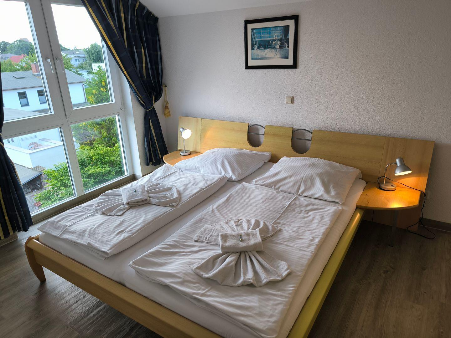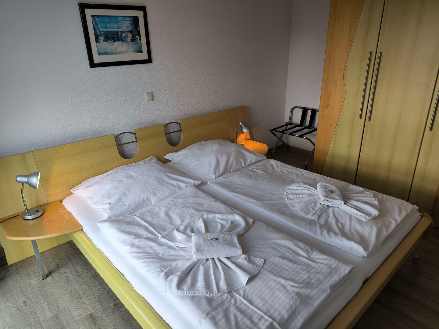 Schlafzimmer mit einem Doppelbett (180 x 200 cm) und großem Kleiderschrank