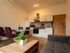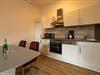 In den Wohnraum integrierte Einbauküche mit 4- Platten- Kochfeld, Backofen, Kühlschrank, Geschirrspüler, Toaster, Kaffeemaschine, Wasserkocher und Küchenutensilien