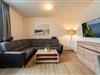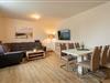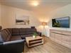 Wohnbereich mit moderner Wohnlandschaft, Couchtisch, Anrichte mit Flat-TV (integr. Radiofunktion) und Esstisch mit 6 Stühlen