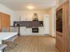 Im Wohnraum integrierte Einbauküche, ausgestattet mit: 4-Platten-Kochfeld, Backofen, Dunstabzugshaube, Kühlschrank ohne Gefrierfach, Geschirrspüler, Toaster, Kaffeemaschine, Wasserkocher und Küchenutensilien