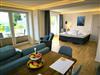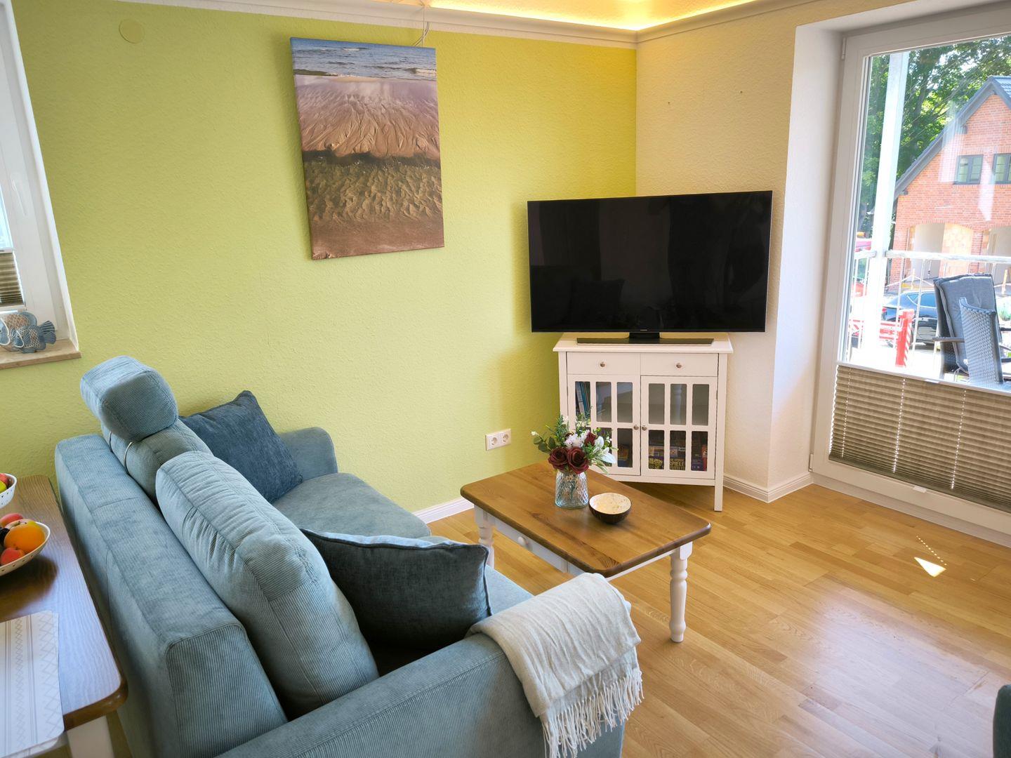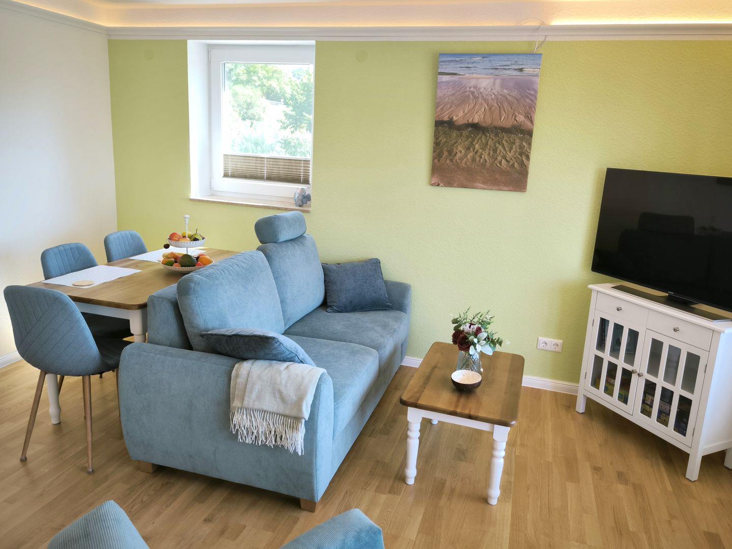 Wohnbereich mit Schlafsofa, Sessel und Couchtisch, 48?-UHD-Smart-TV mit Netflix, Esstisch mit 3 Stühlen