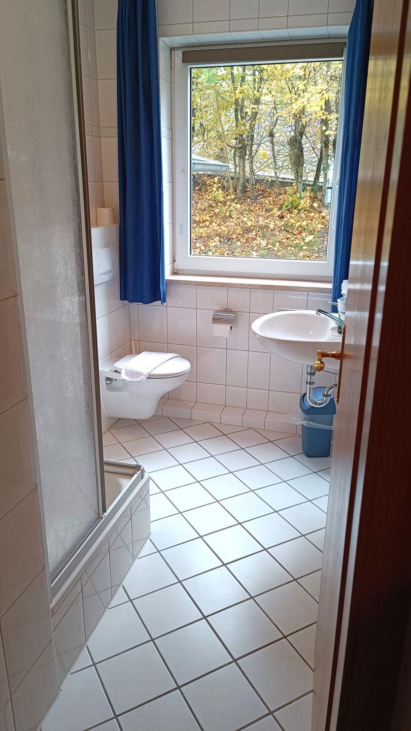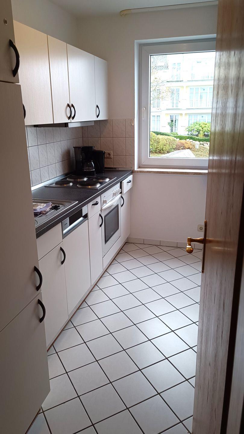Küche ausgestattet mit: 4- Platten-Kochfeld, Backofen, Dunstabzugshaube, Kühlschrank mit Gefrierfach, Geschirrspüler, Toaster, Kaffeemaschine, Wasserkocher und Küchenutensilien