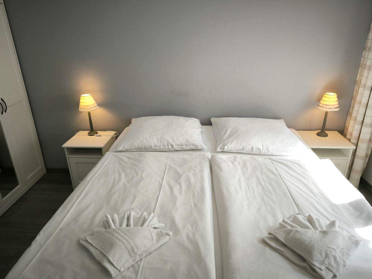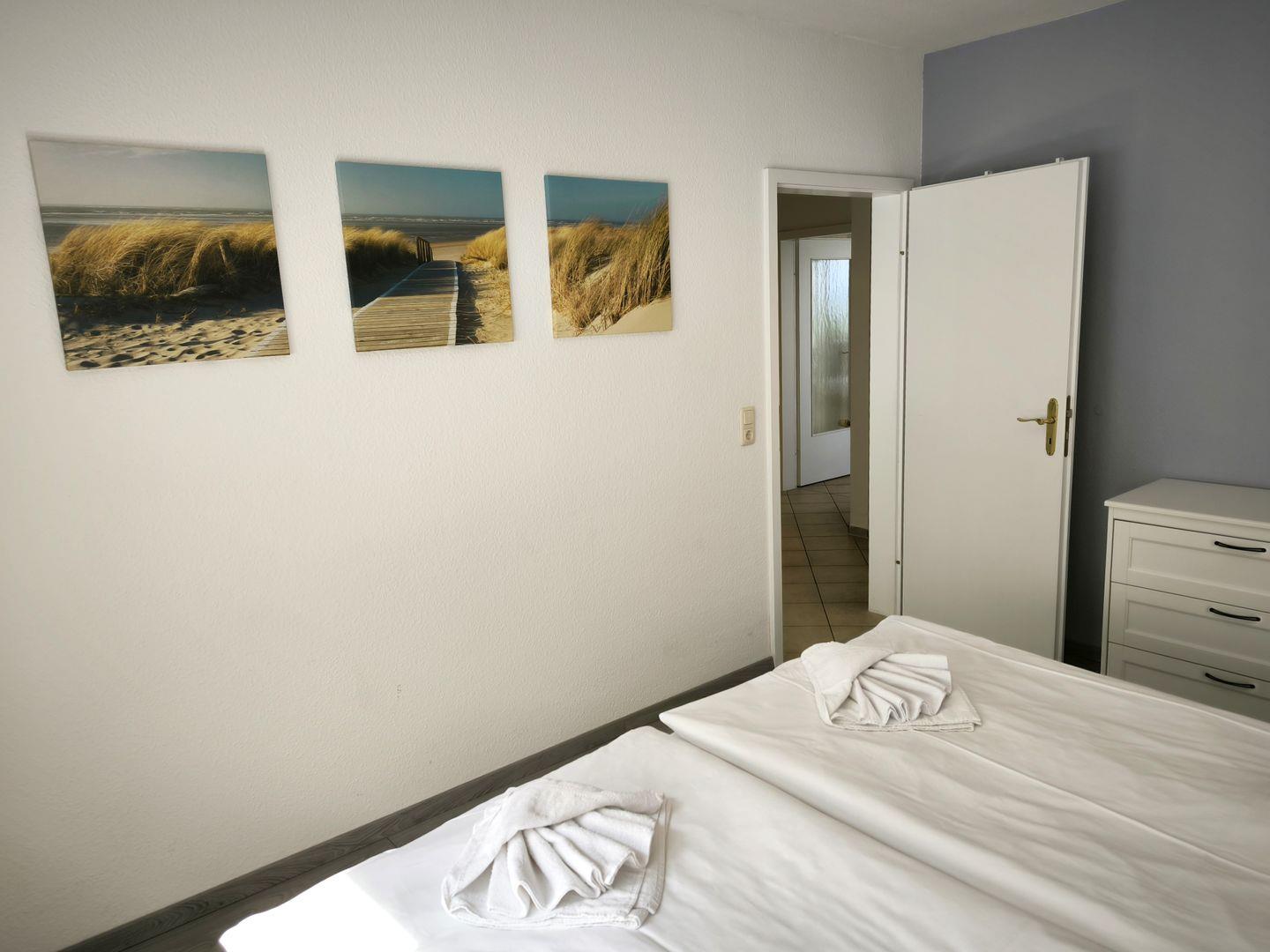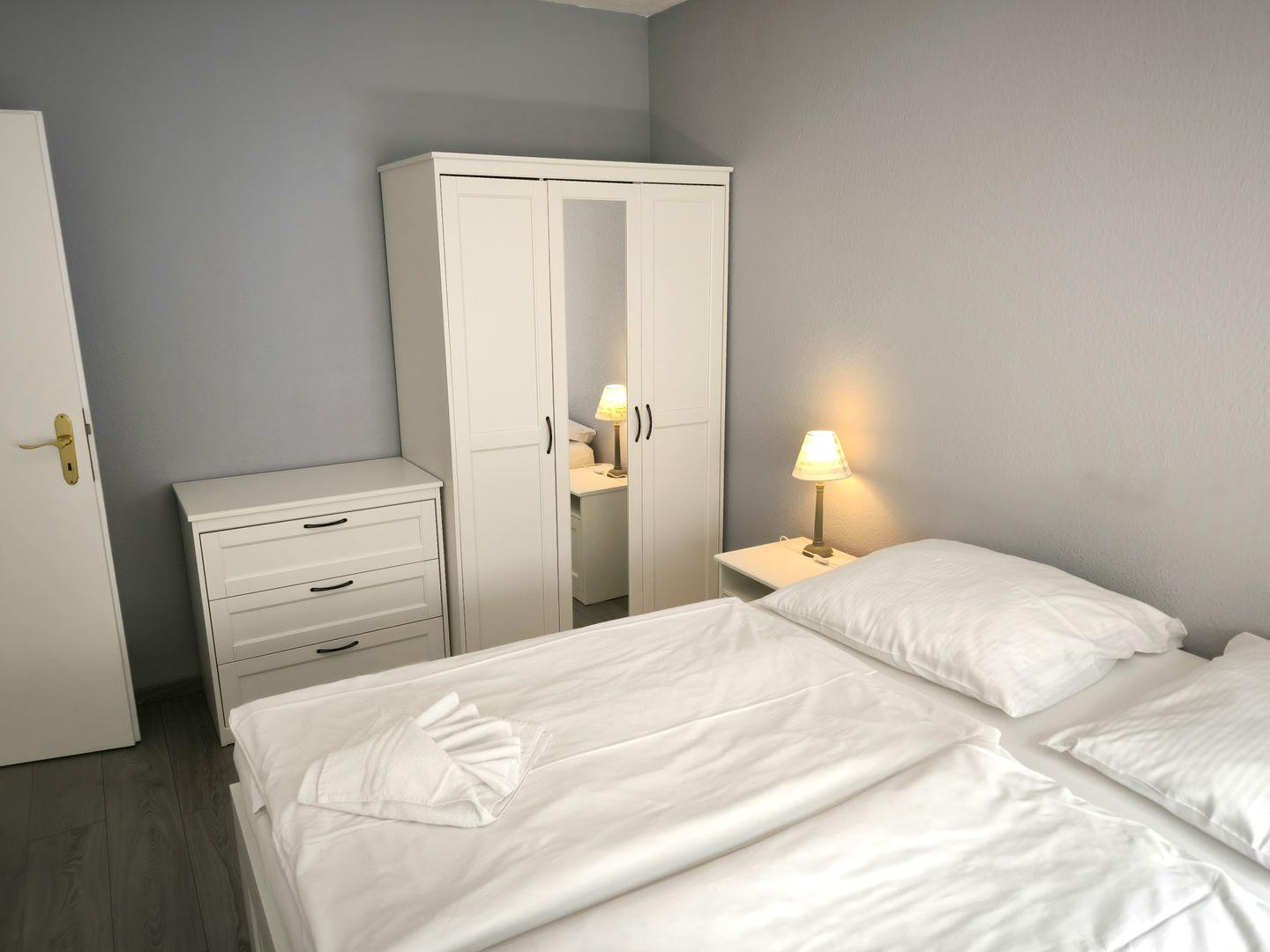 1. Schlafzimmer mit einem Doppelbett (180 x 200 cm), Nachttischen und großem Kleiderschrank