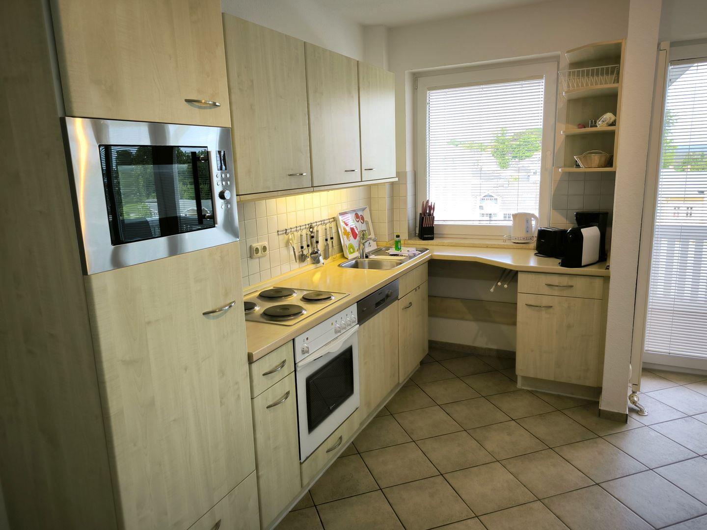 Einbauküche im Wohnbereich integriert, ausgestattet mit: 4-Platten-Kochfeld, Backofen, Dunstabzugshaube, großer Kühlschrank mit Gefrierfach, Geschirrspüler, Mikrowelle, Toaster, Kaffeemaschine, Wasserkocher und Küchenutensilien