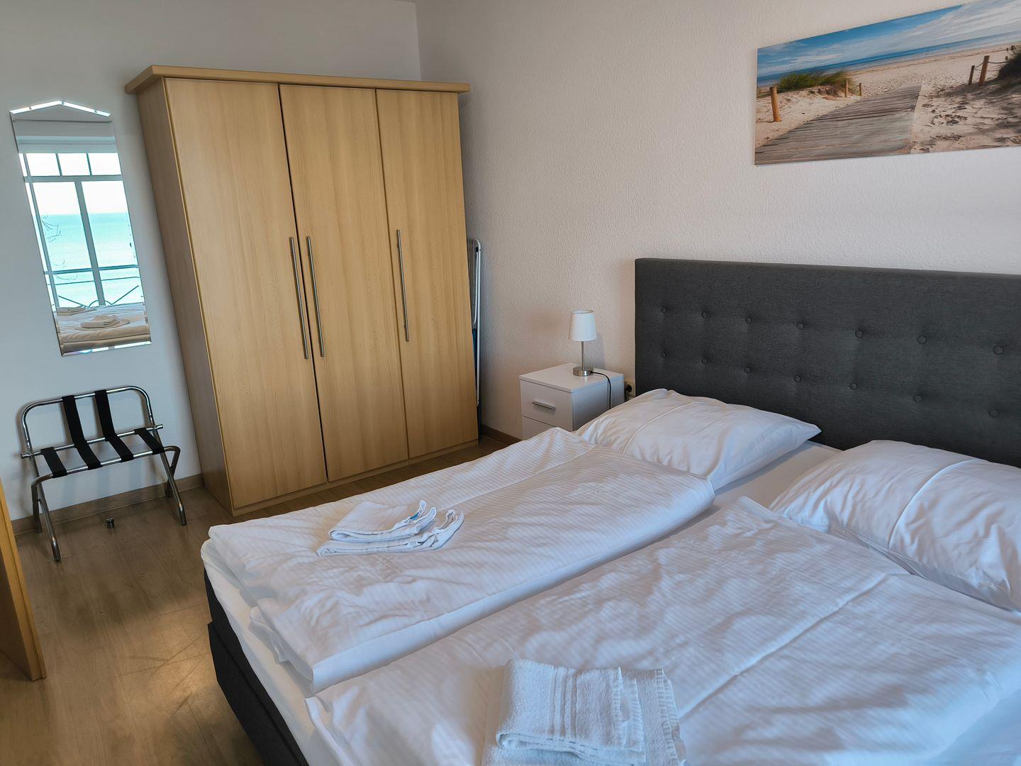 Schlafzimmer mit einem Doppelbett (180 x 200 cm), Nachttischen und großem Kleiderschrank und Kofferablage