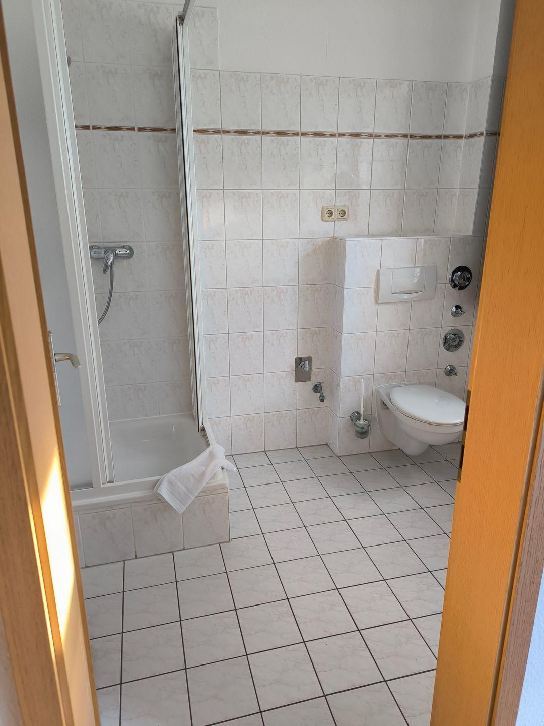 Bad mit Dusche, WC, Föhn und beleuchtetem Kosmetikspiegel