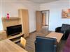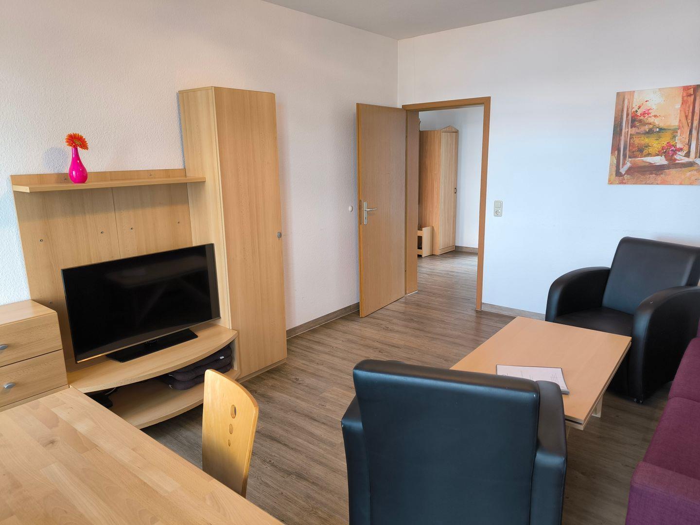 Wohnbereich mit ausziehbarer, moderner Doppelbettschlafcouch (168 x 200 cm), 2 Ledersesseln, Couchtisch, Anrichte mit TV und Esstisch mit 3 Stühlen
