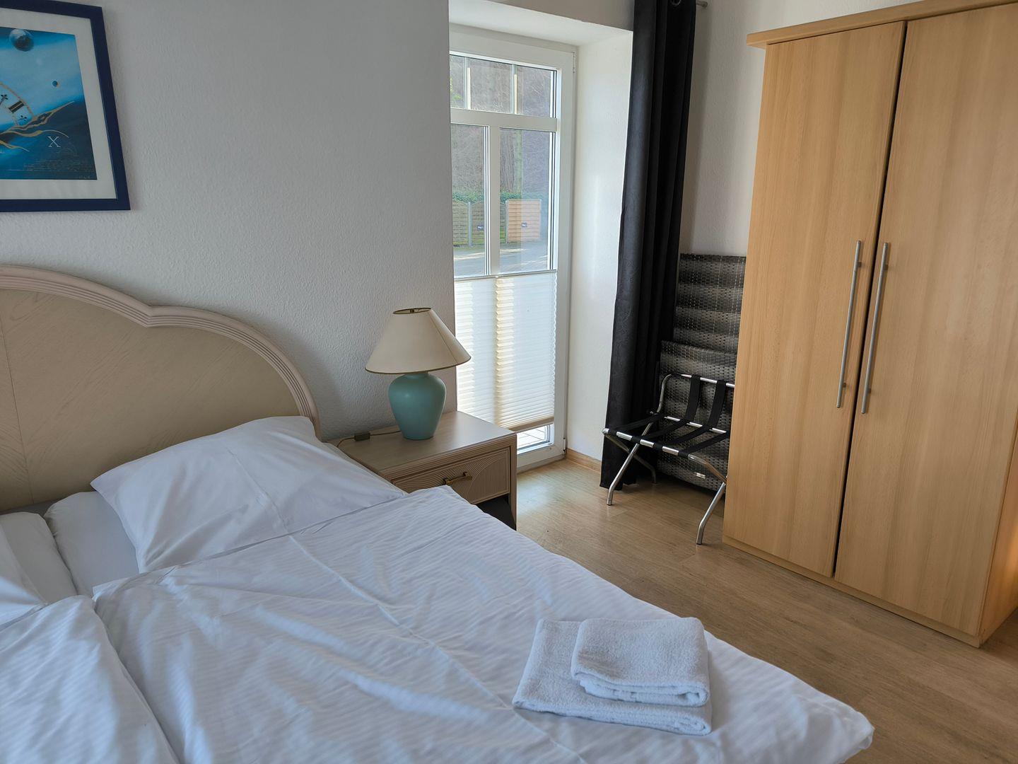 Schlafzimmer mit einem Doppelbett (180 x 200 cm), Nachttischen und großem Kleiderschrank und Kofferablage
