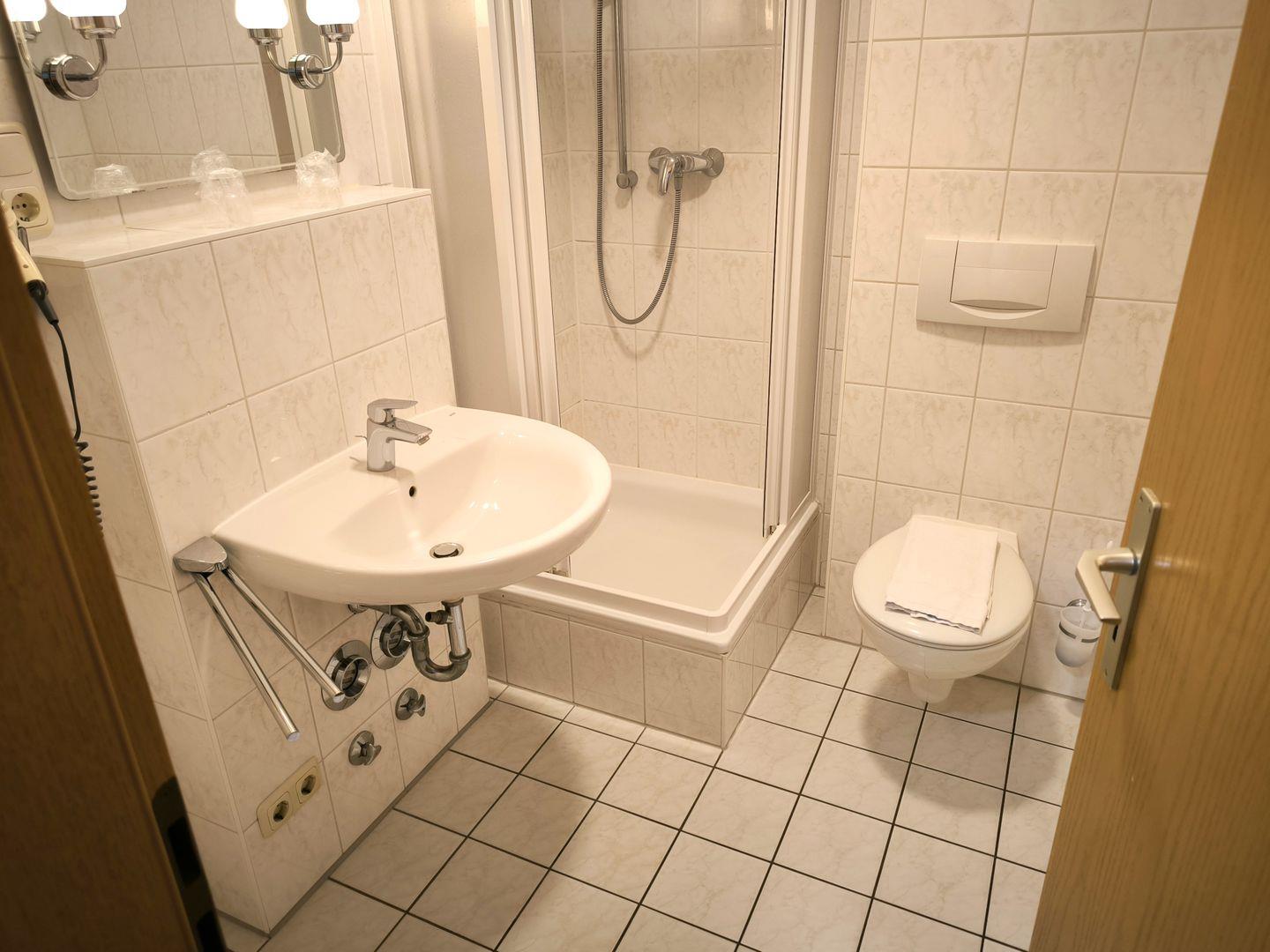 Bad mit Dusche, WC, Föhn und beleuchtetem Kosmetikspiegel