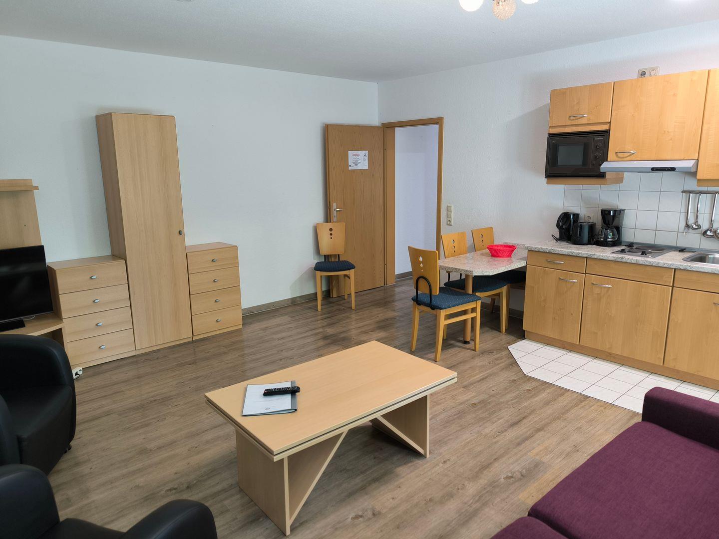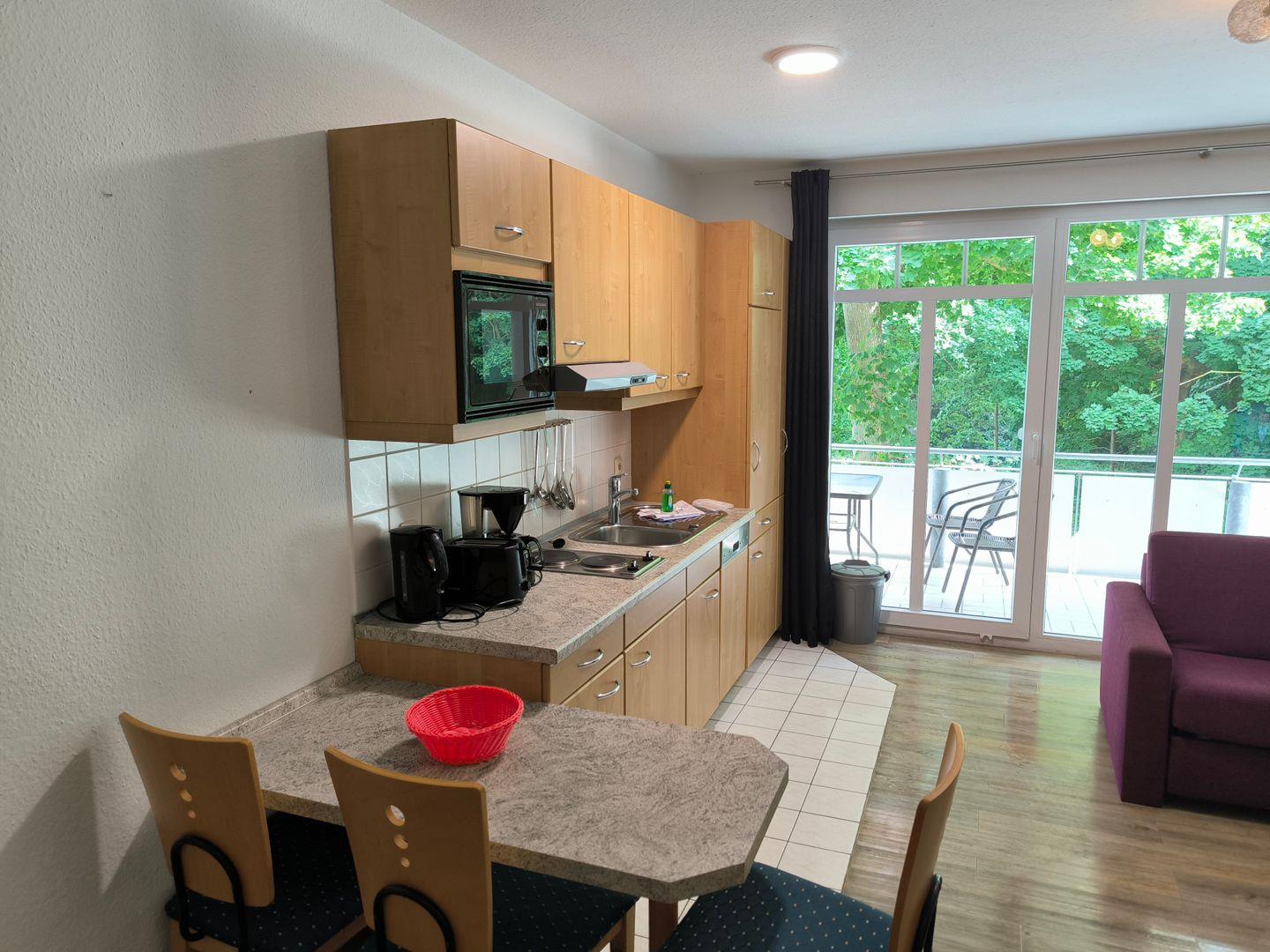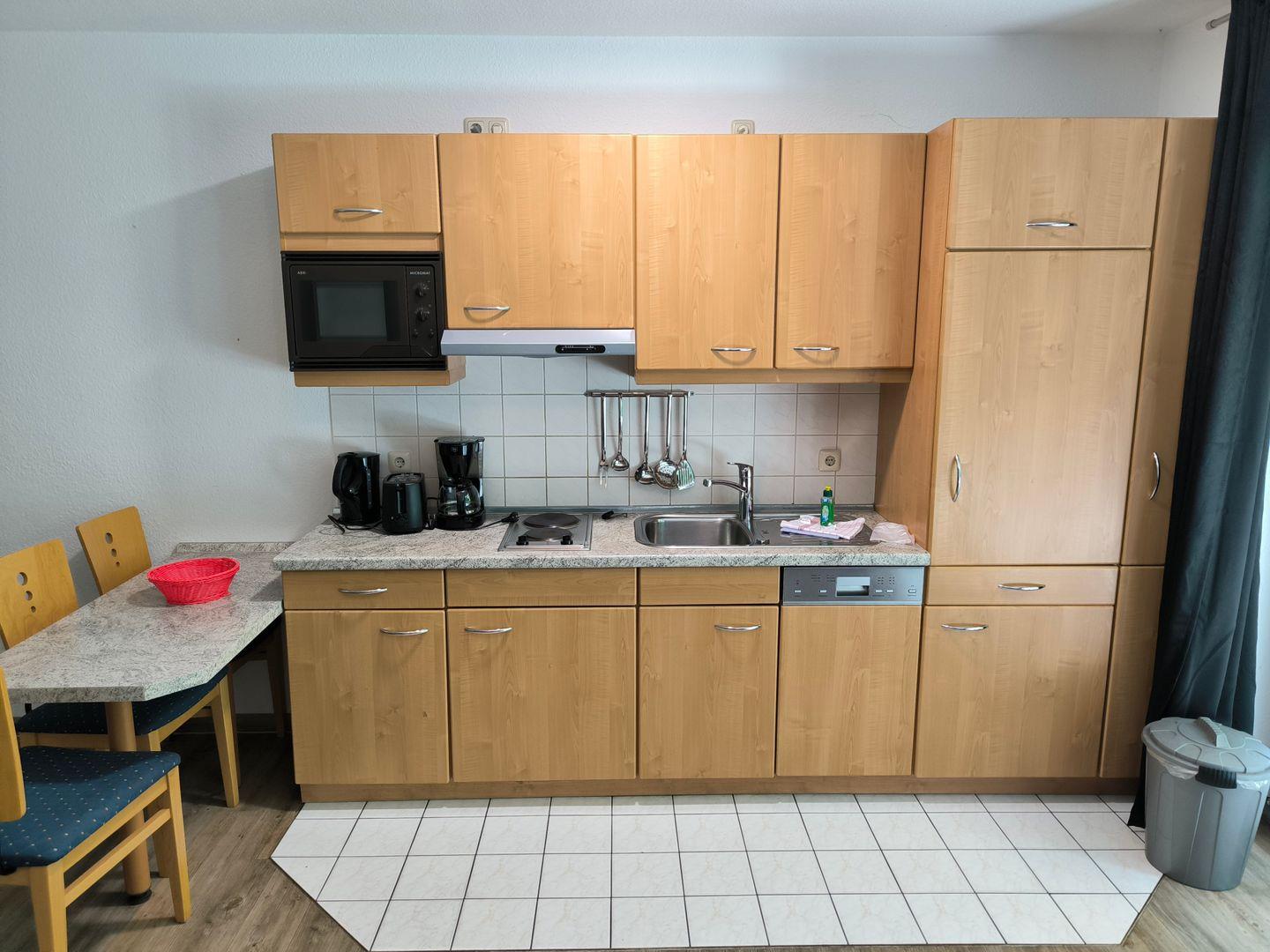 Im Wohnraum integrierte Einbauküche, ausgestattet mit: 2-Platten-Kochfeld, Mikrowelle, Dunstabzugshaube, Kühlschrank mit Gefrierfach, Geschirrspüler, Toaster, Kaffeemaschine, Wasserkocher und Küchenutensilien