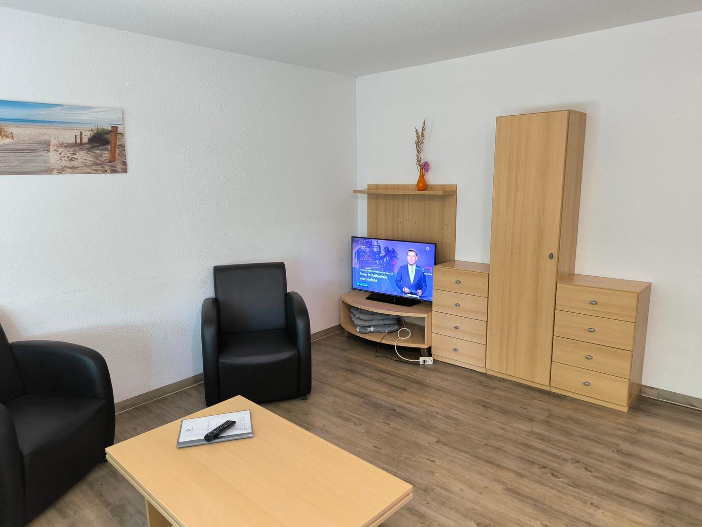 offenes Wohnzimmer mit Couch und Couchtisch sowie 2 Ledersesseln, Anrichte mit TV,