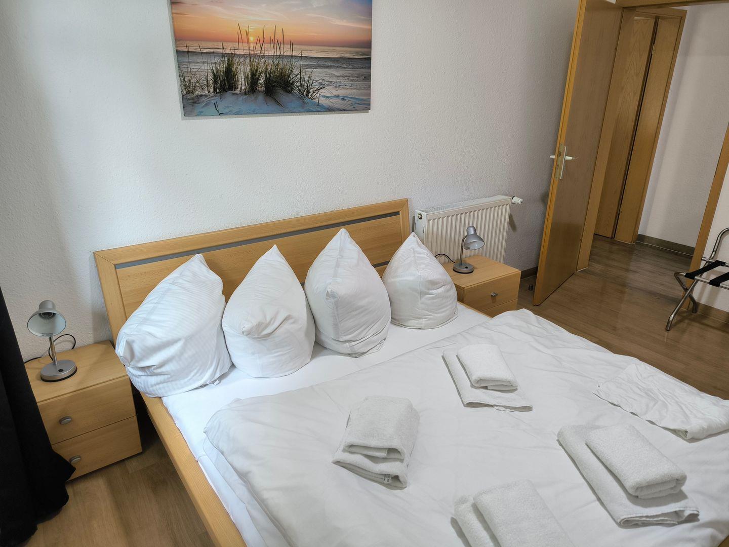 Schlafzimmer mit Doppelbett (180 x 200 cm), Nachttischen, großem Kleiderschrank, Kofferablage
