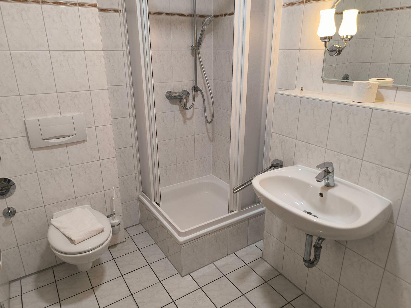 Bad mit Dusche, WC, Föhn und beleuchtetem Kosmetikspiegel