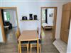 Im Wohnraum integrierte Einbauküche, ausgestattet mit: 2-Platten-Kochfeld, Mikrowelle, Dunstabzugshaube, Kühlschrank mit Gefrierfach, Geschirrspüler, Toaster, Kaffeemaschine, Wasserkocher und Küchenutensilien