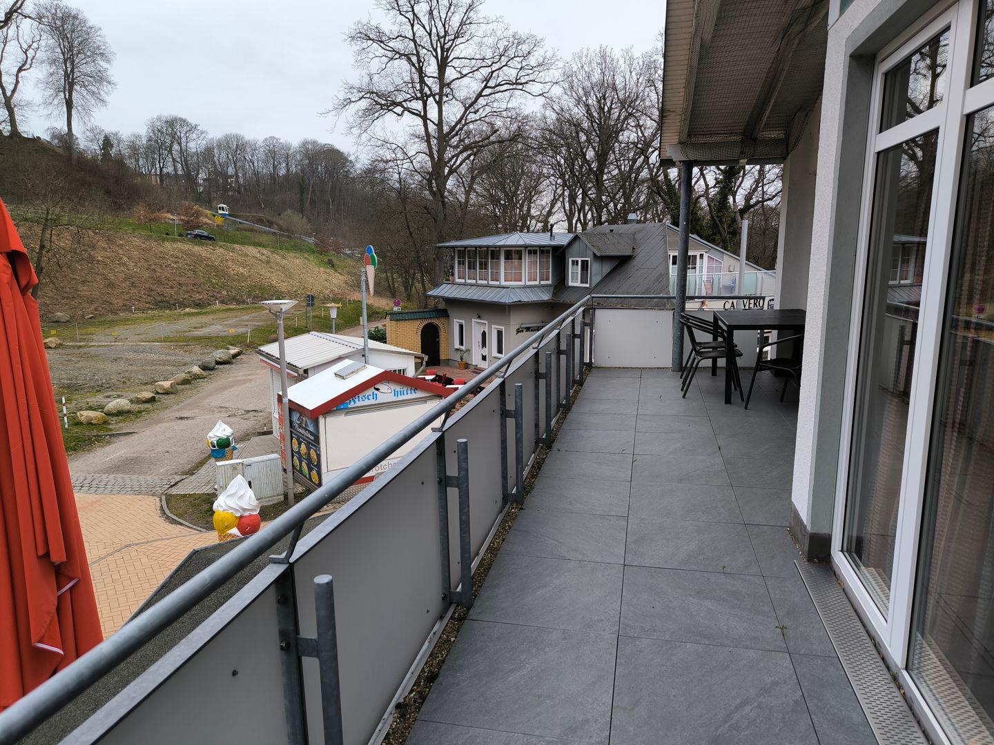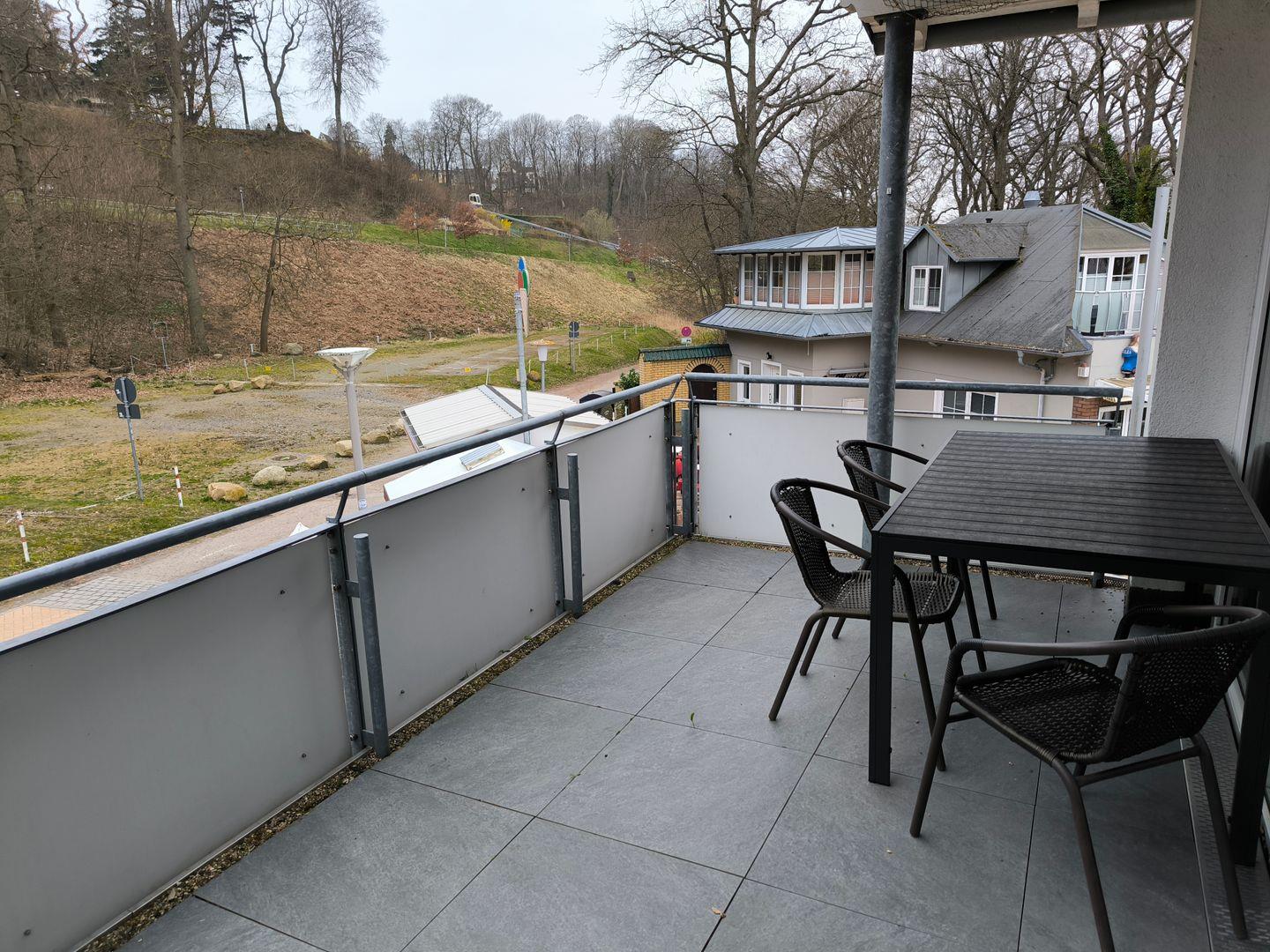 Balkon mit Gartenmöbeln, begehbar vom Wohnzimmer und auch vom Schlafzimmer