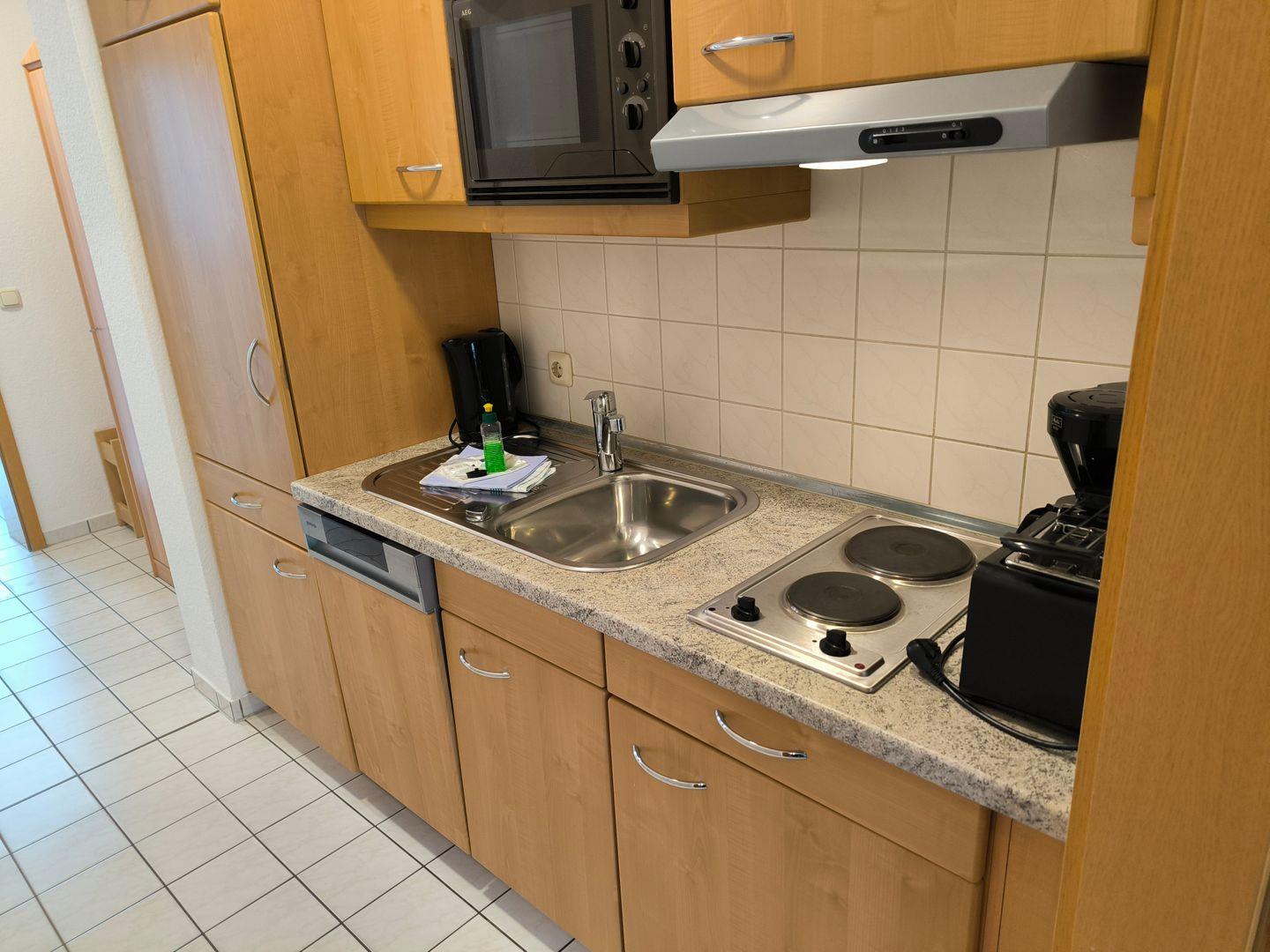 Einbauküche, ausgestattet mit: 2-Platten-Kochfeld, Mikrowelle, Dunstabzugshaube, Kühlschrank mit Gefrierfach, Geschirrspüler, Toaster, Kaffeemaschine, Wasserkocher und Küchenutensilien