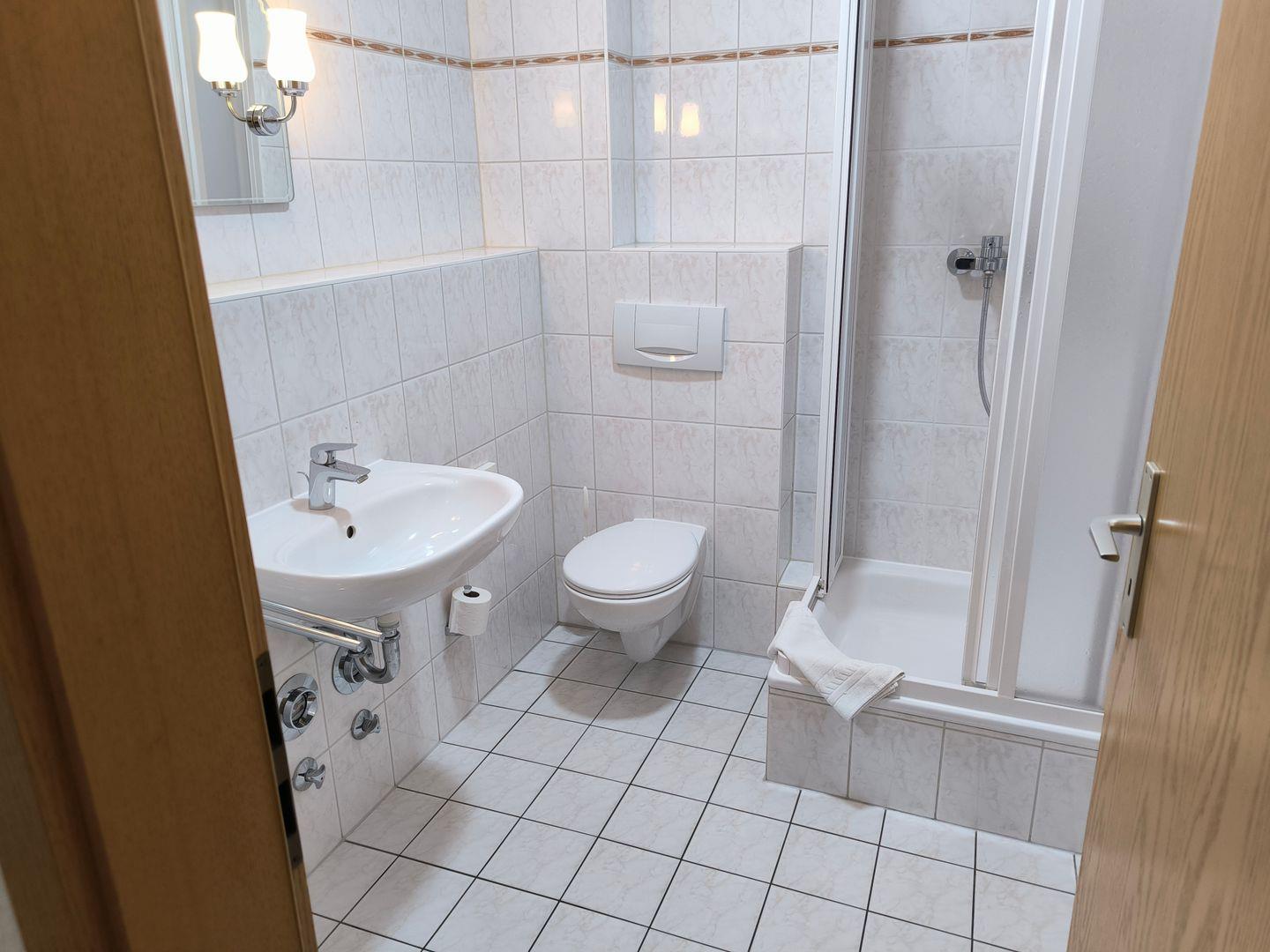 Bad mit Dusche, WC, Föhn und beleuchtetem Kosmetikspiegel