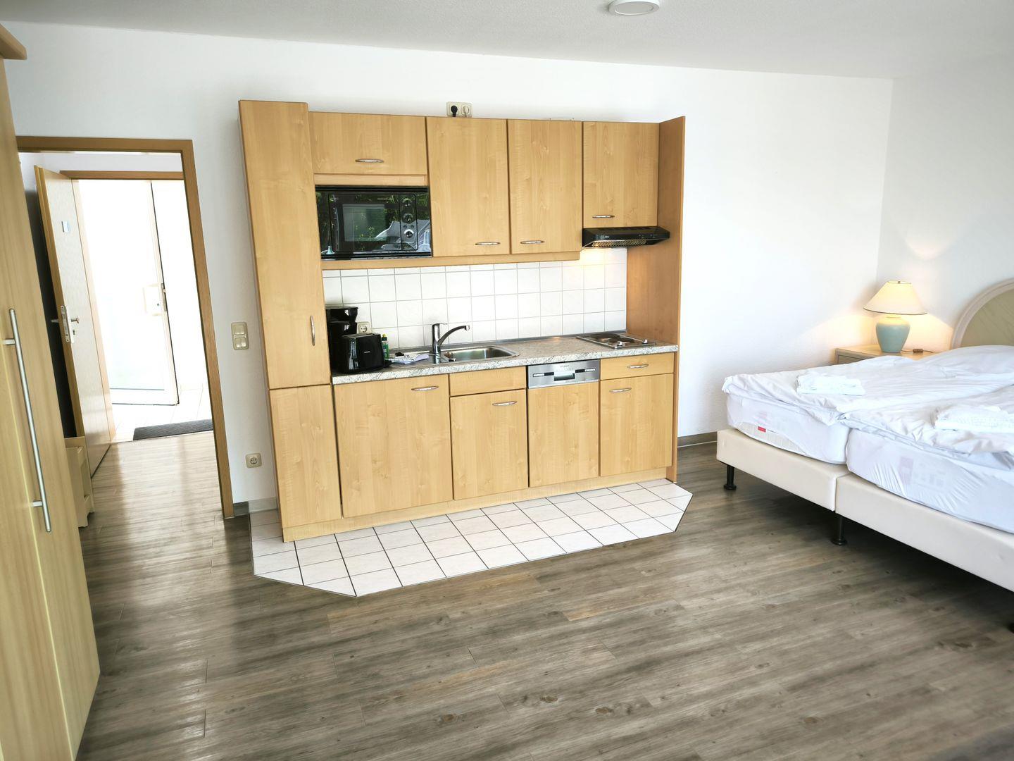 Im Wohnraum integrierte Einbauküche, ausgestattet mit: 2-Platten-Kochfeld, Mikrowelle, Dunstabzugshaube, Kühlschrank mit Gefrierfach, Geschirrspüler, Toaster, Kaffeemaschine, Wasserkocher und Küchenutensilien