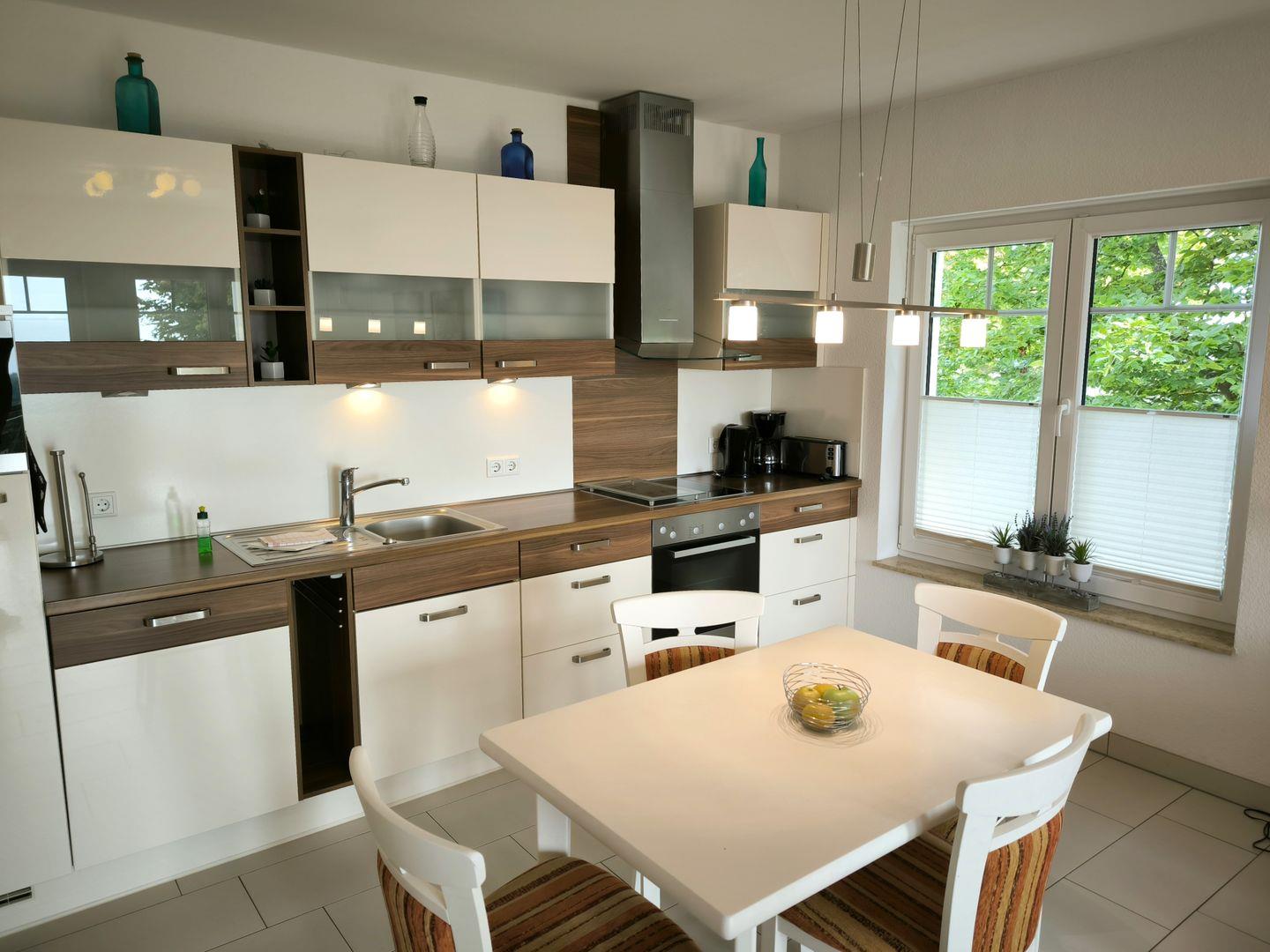 Einbauküche mit 4-Platten-Cerankochfeld, Backofen, Mikrowelle, großer Kühlschrank mit Gefrierfach, Geschirrspüler, Toaster, Kaffeemaschine, Wasserkocher, Mixer und hochwertigen Küchenutensilien