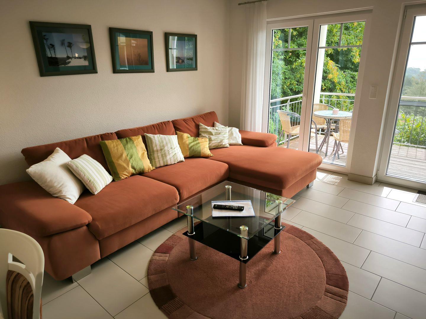 Großzügiger Wohnbereich mit Eckcouch und Couchtisch, TV und CD-Radio, Esstisch mit 4 Stühlen