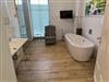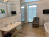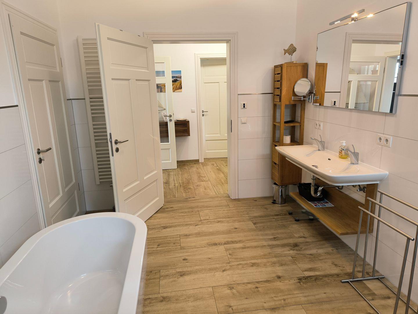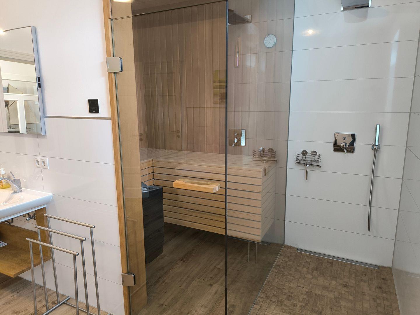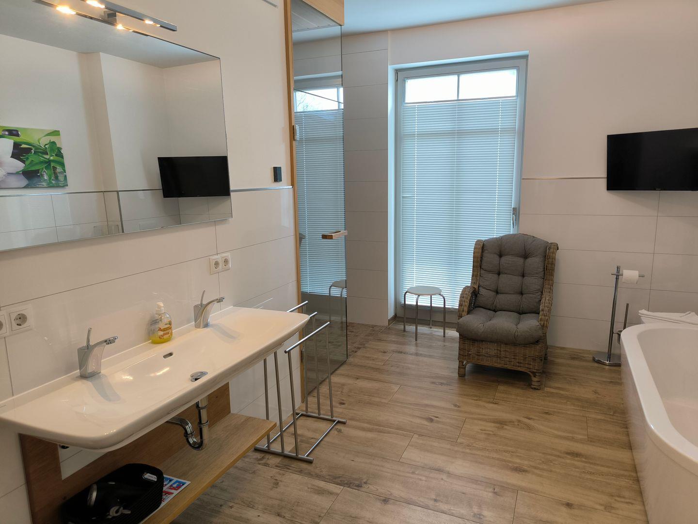 1 Bad mit großer ebenerdiger Dusche, großer Waschtisch, 1 freistehende Badewanne, WC, Fön, Duschhocker, 1 Korbsessel, Kosmetikspiegel, Sauna, kleiner Flat-TV mit Radiofunktion (22 Zoll) und Fenster