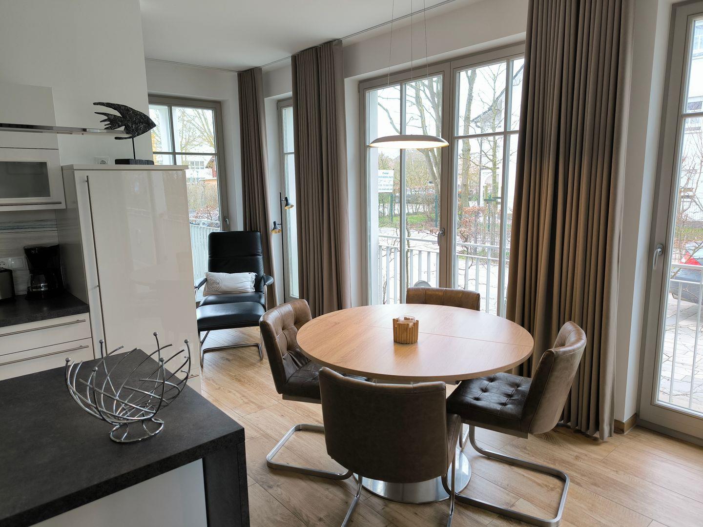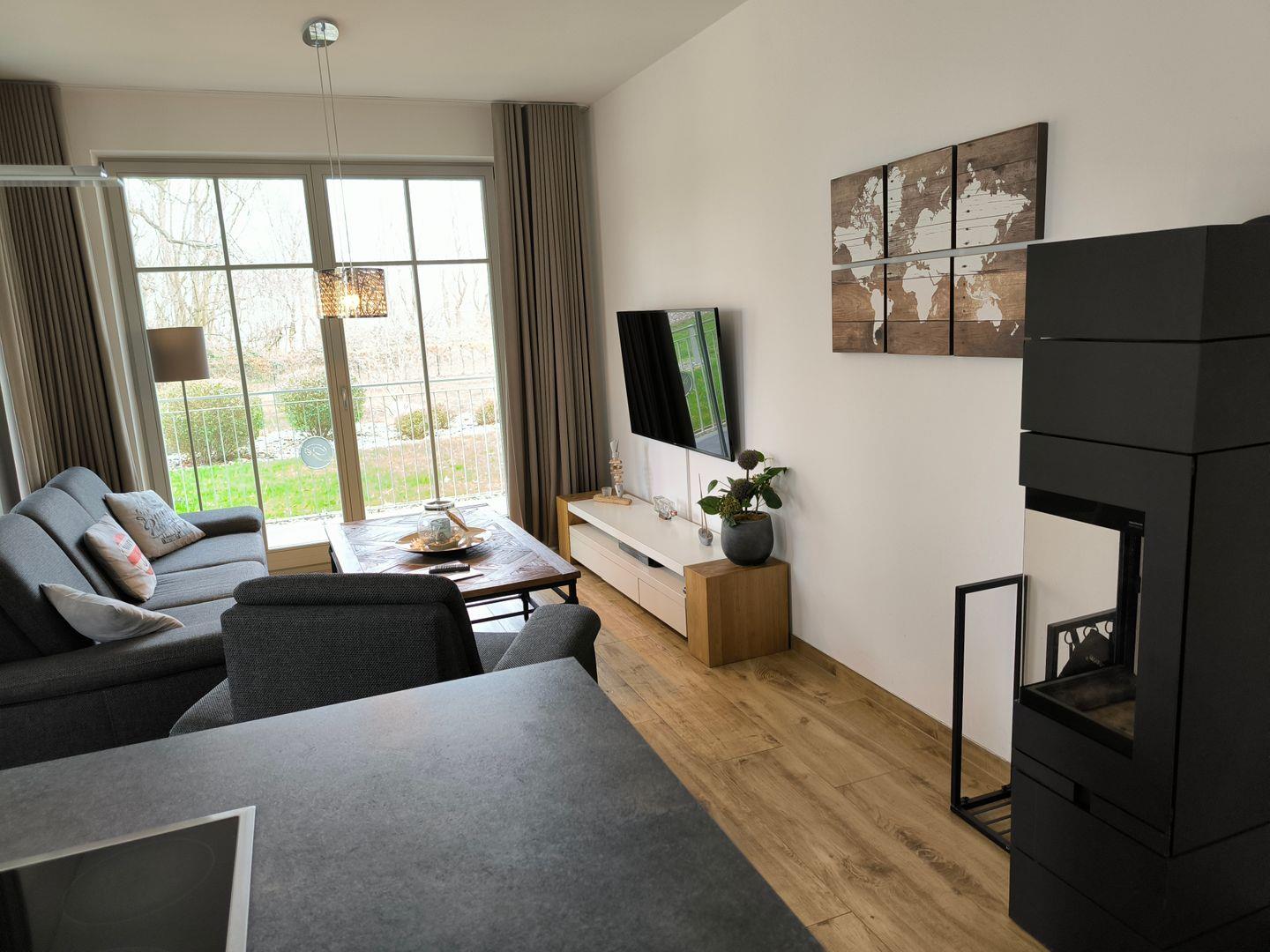 Großzügiger Wohnbereich mit 1 Couch, 1 Sessel und 1 Couchtisch, Anrichte mit großem Flat-TV mit Radiofunktion (55 Zoll), Esstisch mit 4 Stühlen, Kamin, Leseecke mit Sessel und Schreibtisch