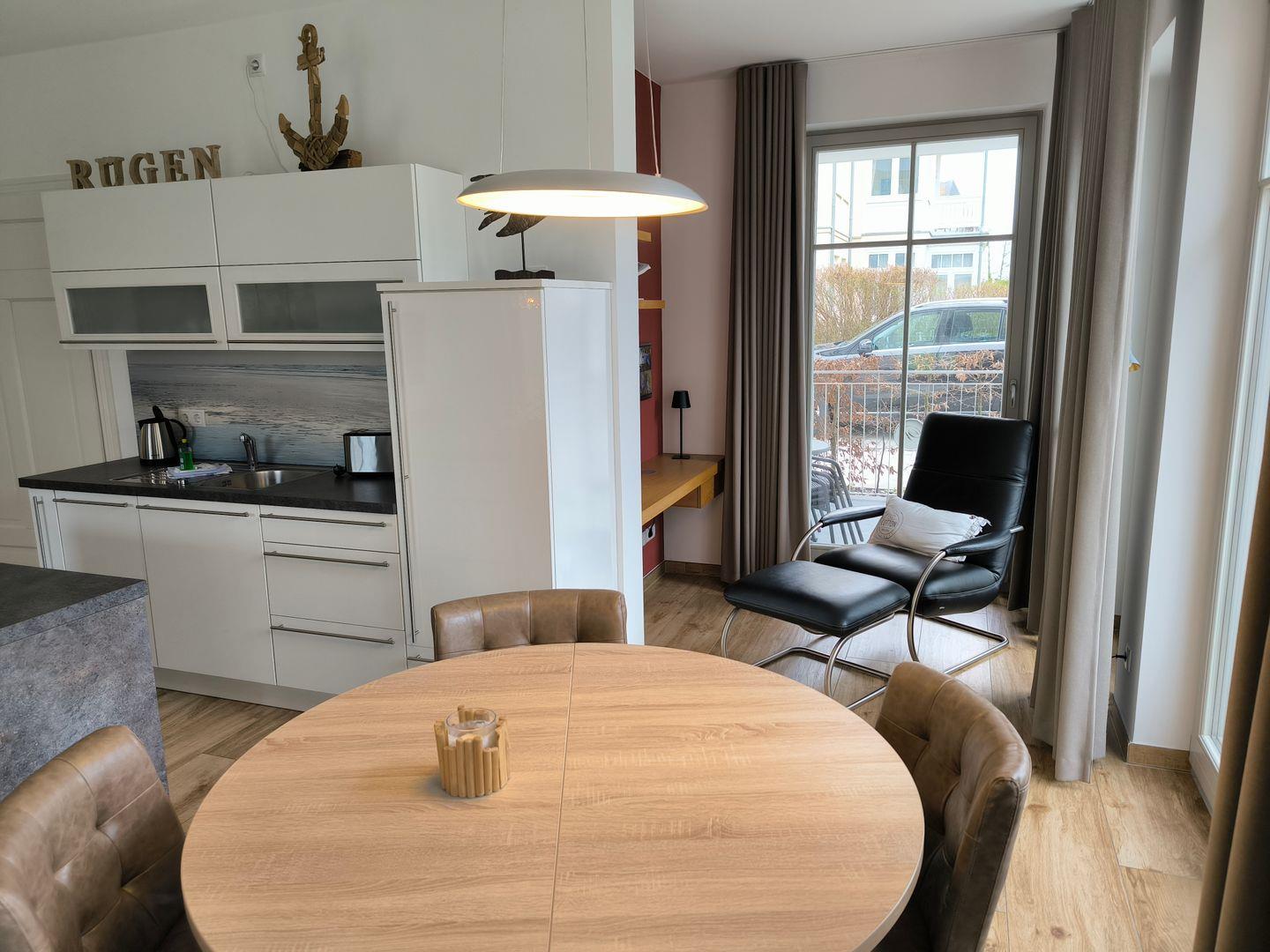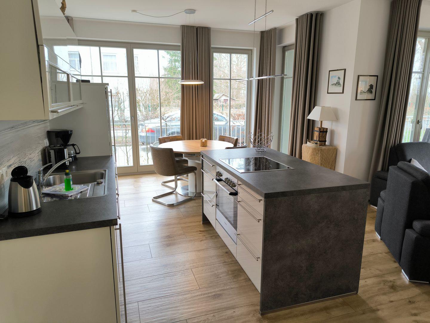 im Wohnraum integrierte Einbauküche, ausgestattet mit: 4-Platten-Cerankochfeld, Backofen, Kühl-Gefrierkombination, Geschirrspüler, Toaster, Kaffeemaschine, Wasserkocher und Küchenutensilien
