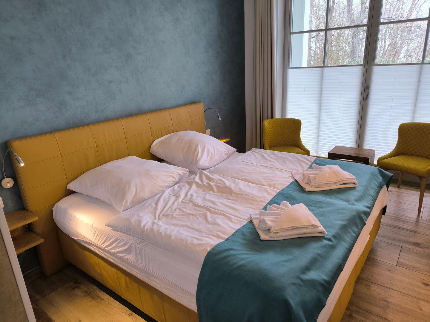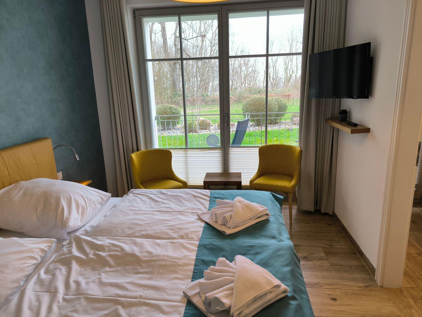 1 Schlafzimmer mit einem Komfortdoppelbett (180 x 200 cm), 2 Nachttische mit Nachttischlampen und großer Kleiderschrank, 1 Stummer Diener, Flat-TV mit Radiofunktion (32 Zoll), Zugang zur kleinen Terrasse