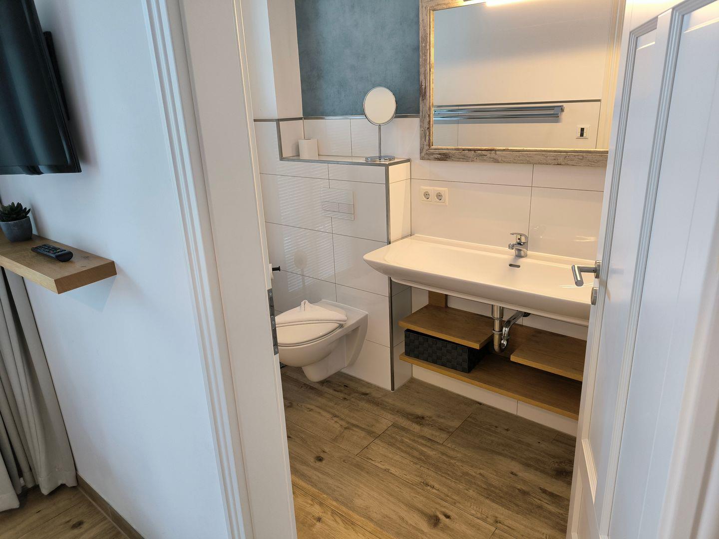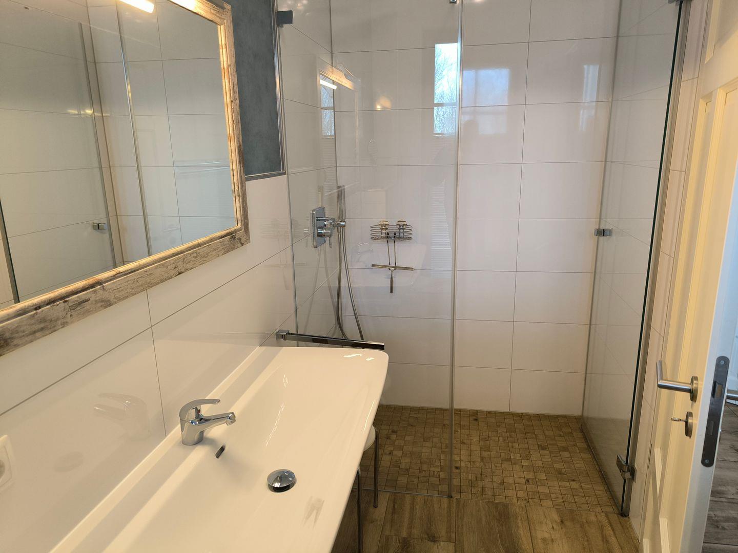 1 Bad mit ebenerdiger Dusche, Waschtisch, WC, Föhn, Kosmetikspiegel, 1 Duschhocker und Fenster