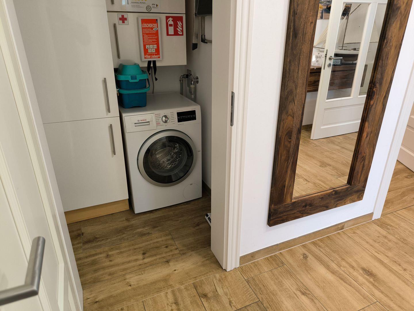 Hauswirtschaftsraum mit: 1 Bügelbrett und 1 Bügeleisen, 1 Waschmaschine mit Wäschetrockner (kostenfrei), 1 Staubsauger, 1 Besen, 1 Kehrblechgarnitur, 1 Wischer, 1 Wäscheständer mit Klammern
