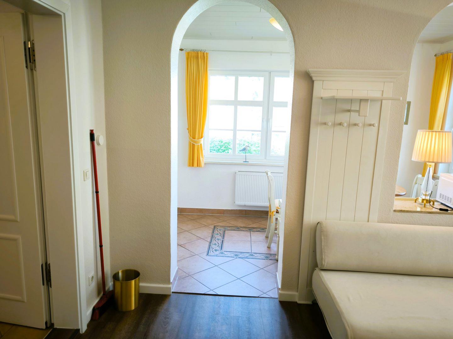 separate Küche mit 4- Platten- Kochfeld, Backofen, Kühlschrank, Toaster, Kaffeemaschine, Wasserkocher und Küchenutensilien