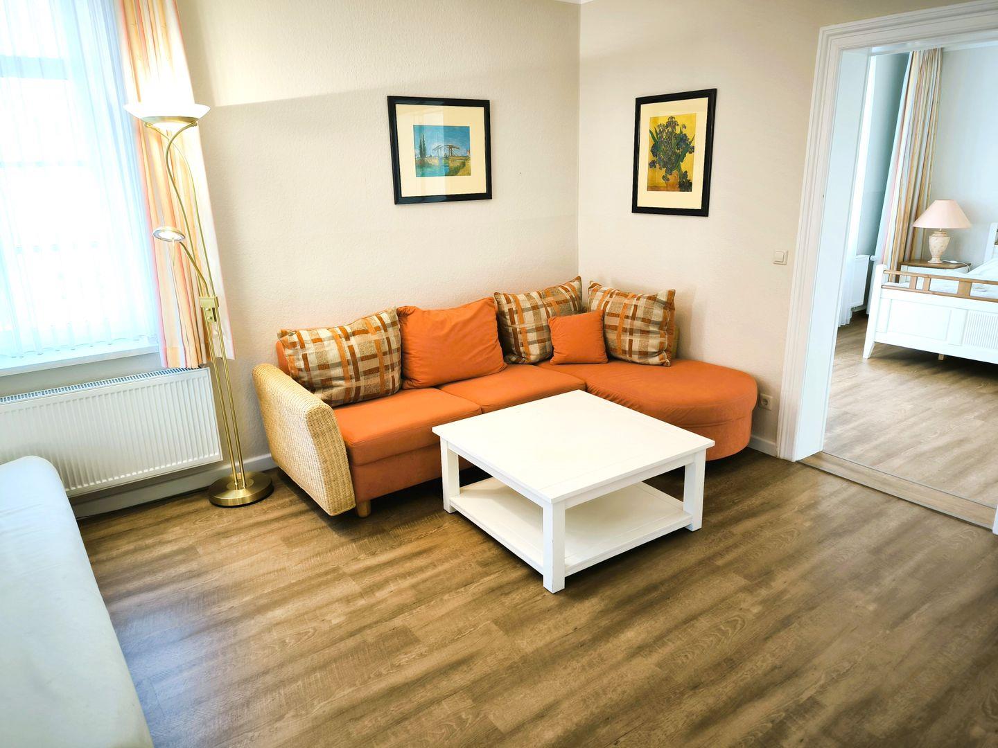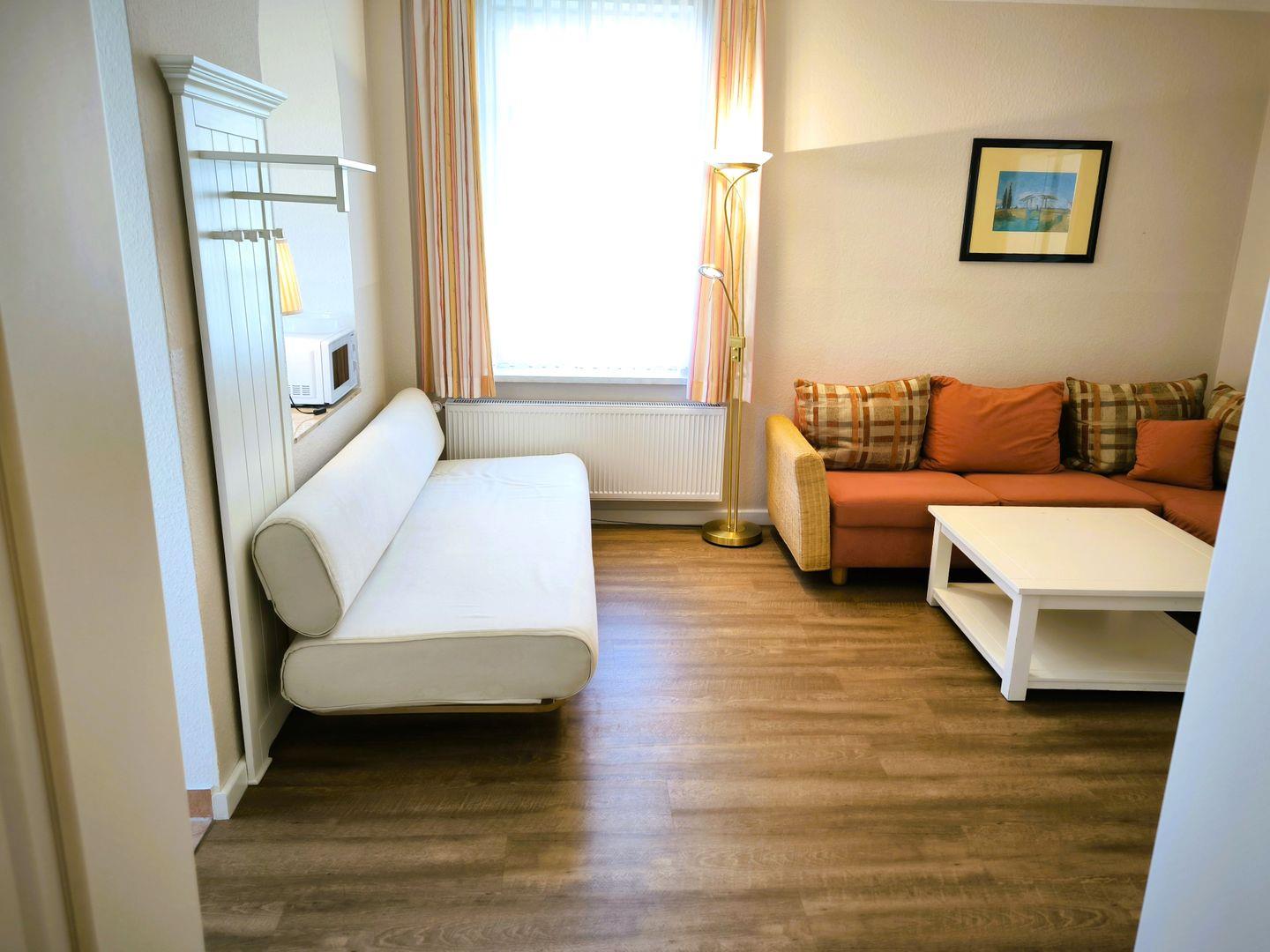 Wohnbereich mit moderner Wohnlandschaft, ausziehbarer Couch, Couchtisch, LED-TV, Radio